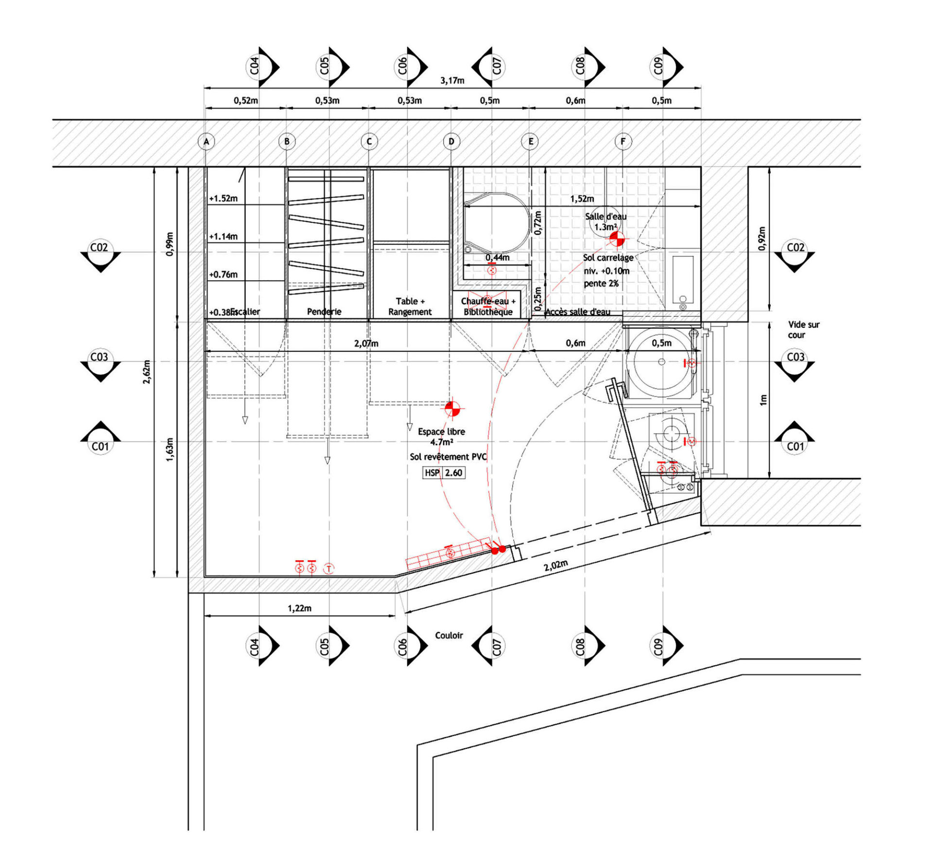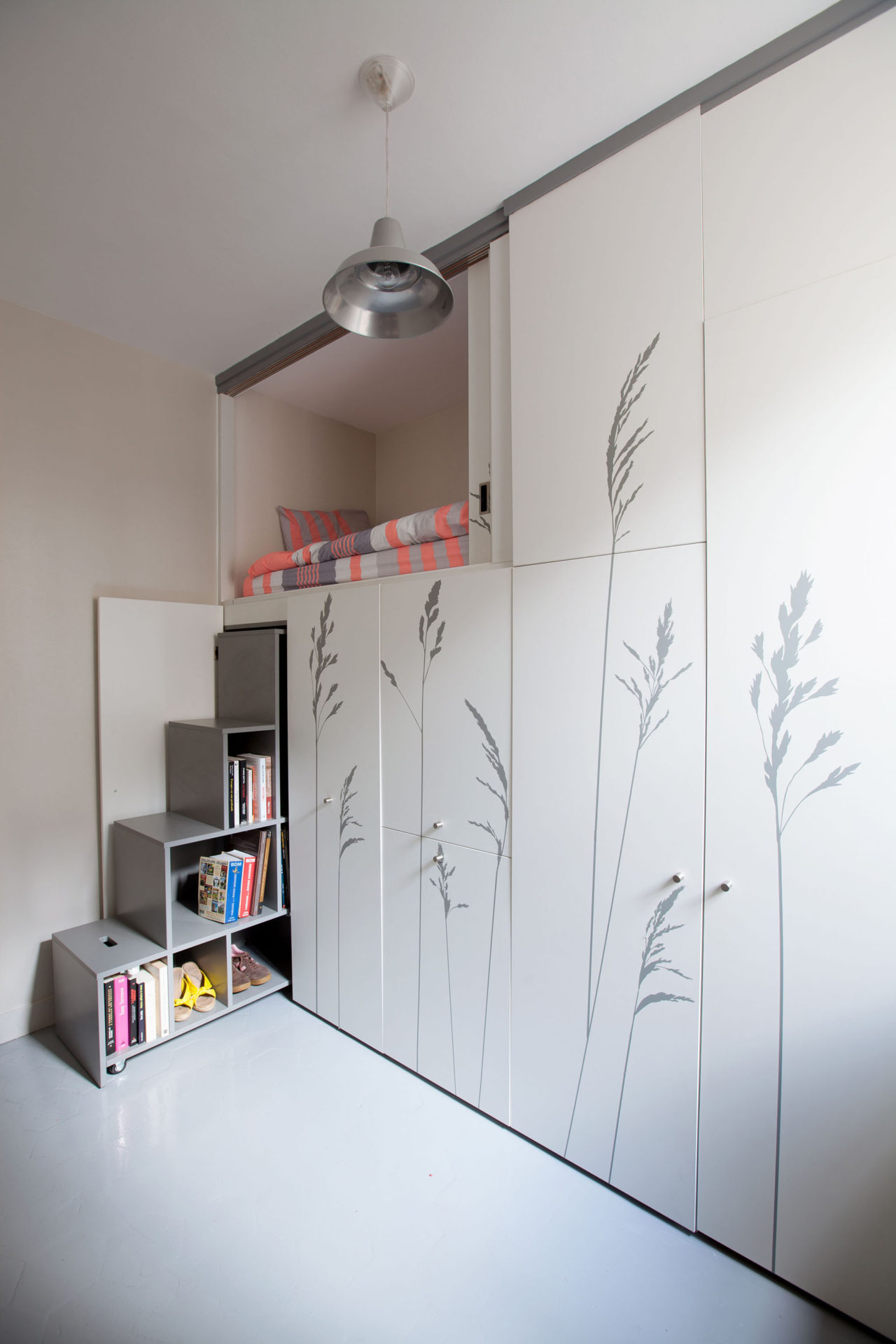 It’s due to a lack of space and in anticipation of the coming of a future au pair they cannot receive directly in their apartment that our clients have entrusted us with the difficult task of arranging the 8sqm maid’s room. Despite the small area, the space had to be functional in order to sleep, and also to cook, eat, wash, work and store a maximum of items. The space should guarantee the independence of the future occupant.