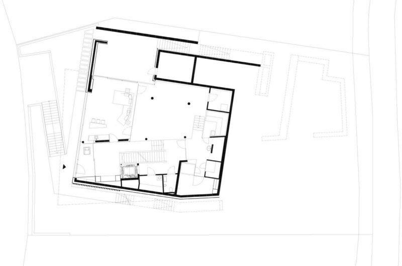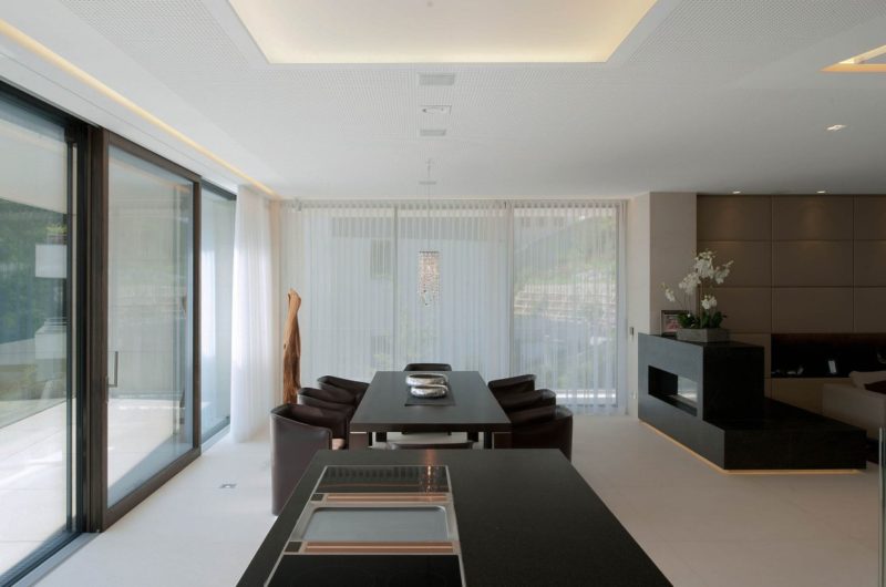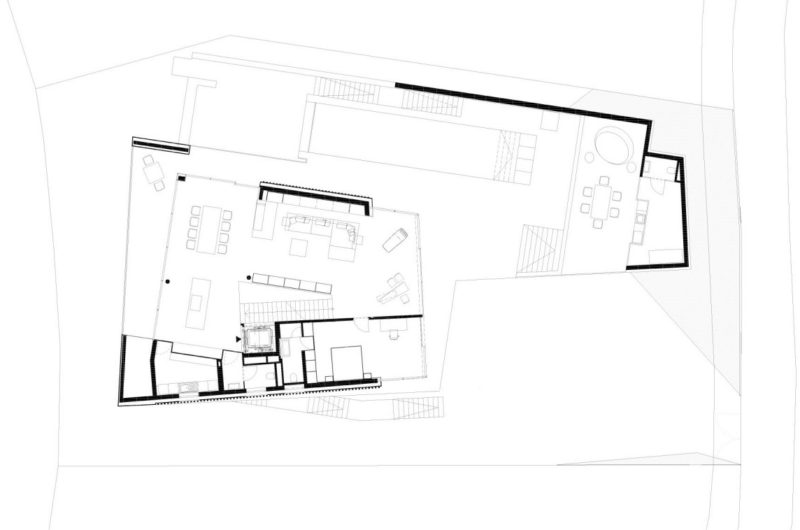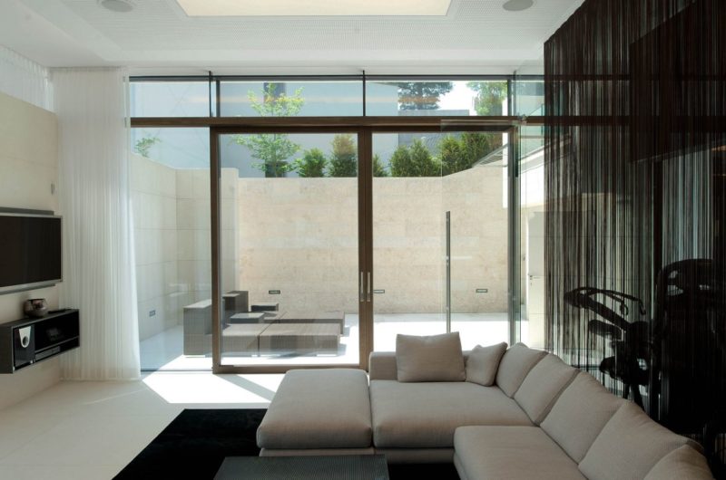 The interior and the exterior space seem to merge due to the large-sized stone panels that flow inside and out.