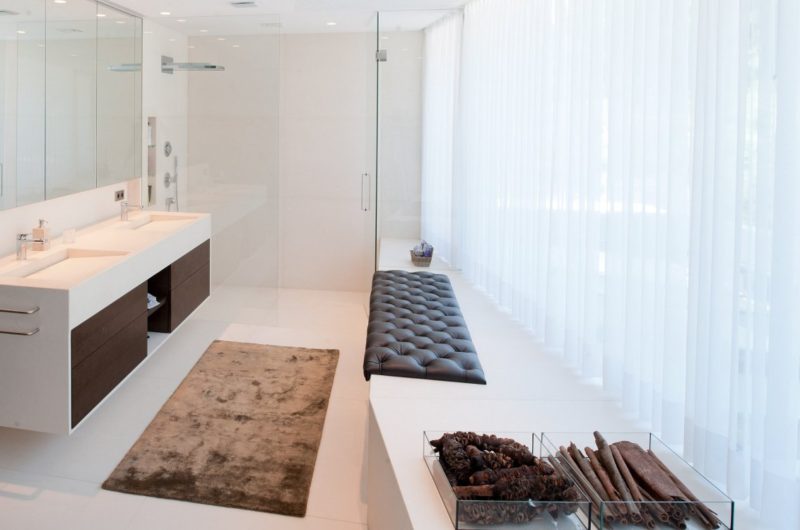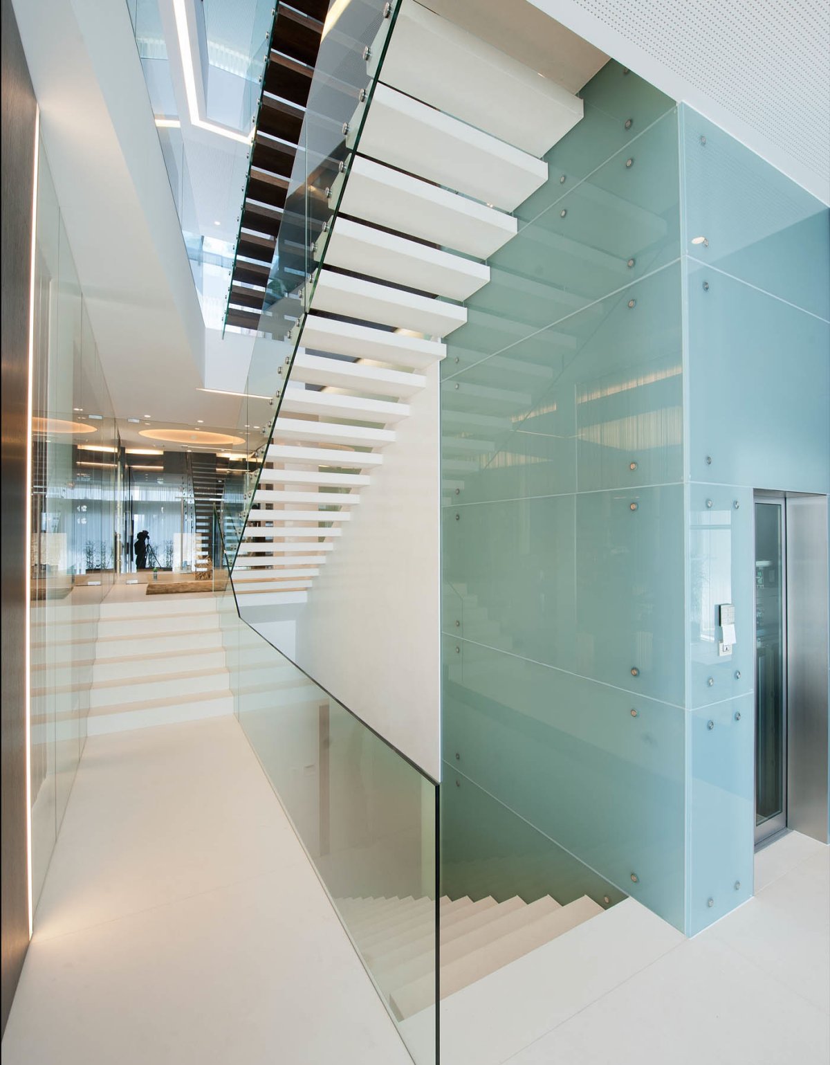 Moving forward to the interior design, this one was emphasized by dark oak, natural stone, glass and leather. The elevator shaft is considered to be the vertical “backbone” of the building, with a glazed interior and back-illumination. Not to mention about the glass front on every floor that offers panoramic views over the city.