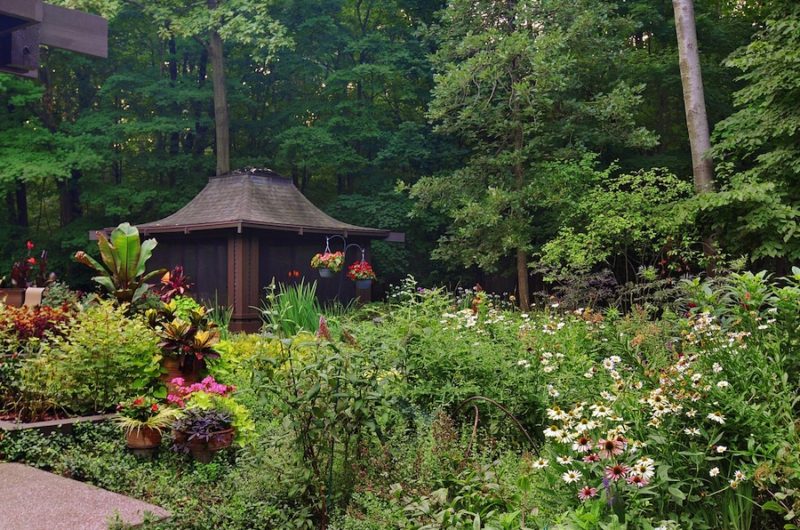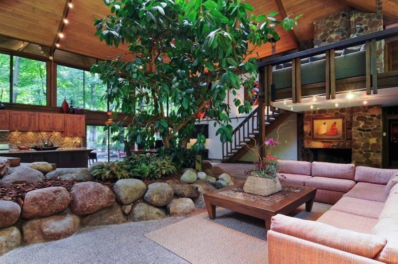 The existing rubber tree plays its role very well and proves that all you need is a tree instead of some sustaining walls for your living room.