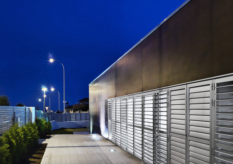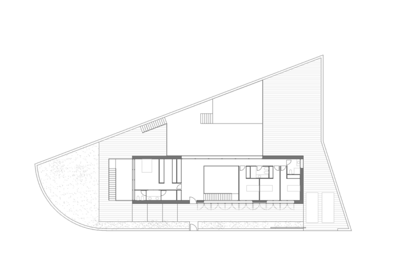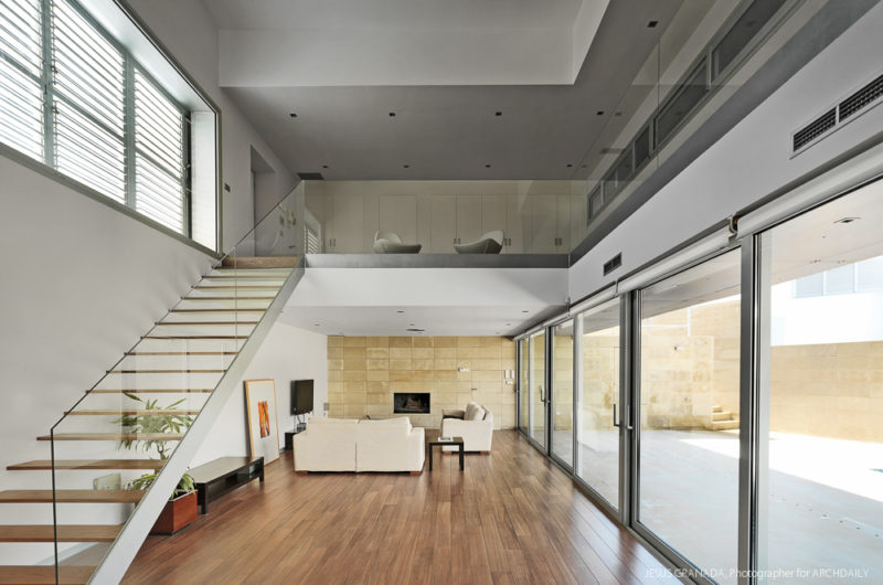 Although they had planning permission for 1 story at ground level, the owners wanted to build double the permitted area and they managed to realize that by excavating a large patio one full storey high over which a round and simple volume was planted.