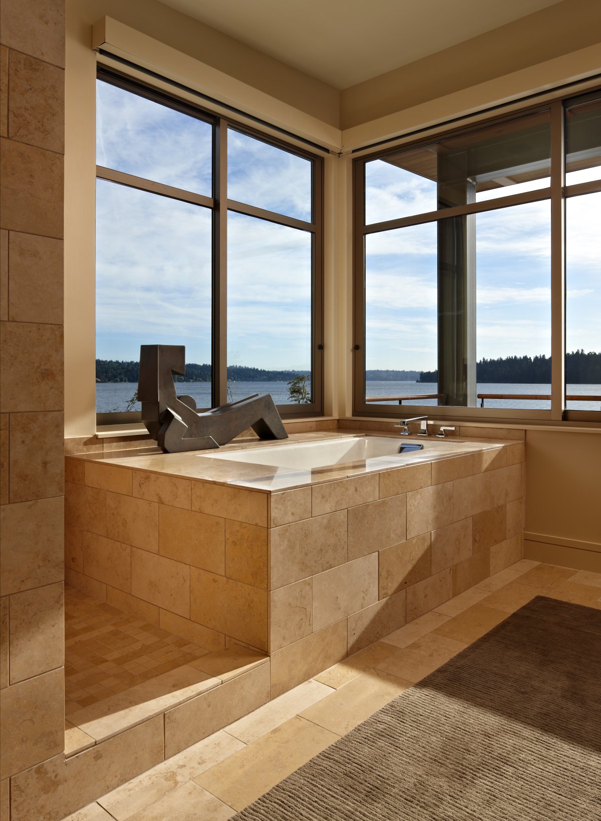 It’s a single living environment that expresses the seeming dichotomy between the interior and exterior living spaces, nicely arranged round the central kitchen and hearth. The feeling of home is given by the work of master craftsmen in stone, plaster and steel.