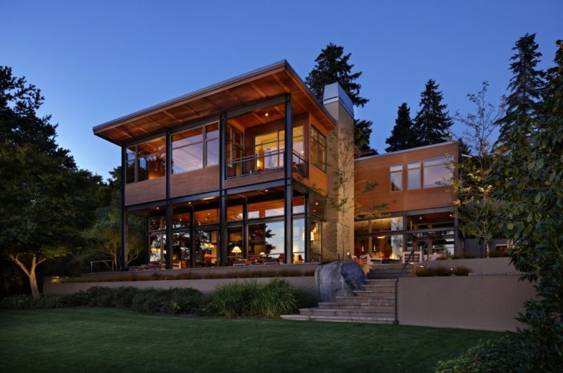 The Lake House 2 was designed by the Seattle-based McClellan Architects. It is sited on a steep waterfront lot with drive access and its structure is made out of steel, being programmed as a primary residence.