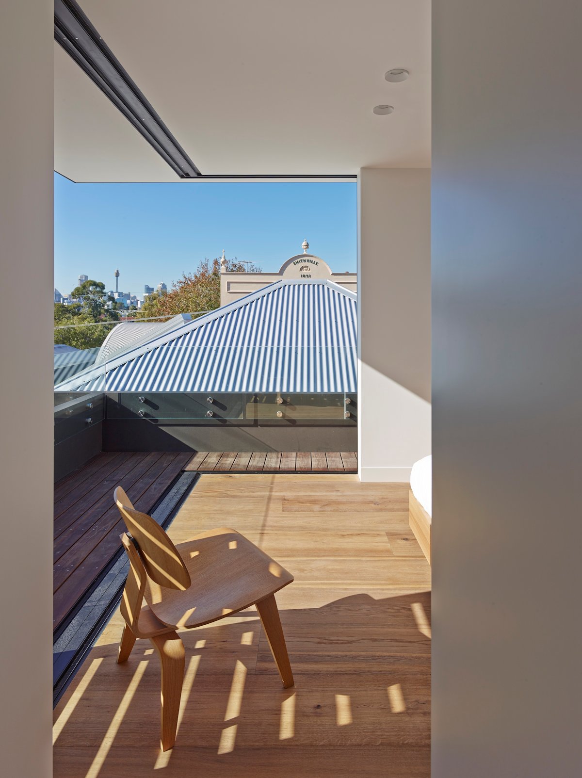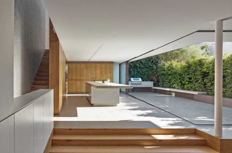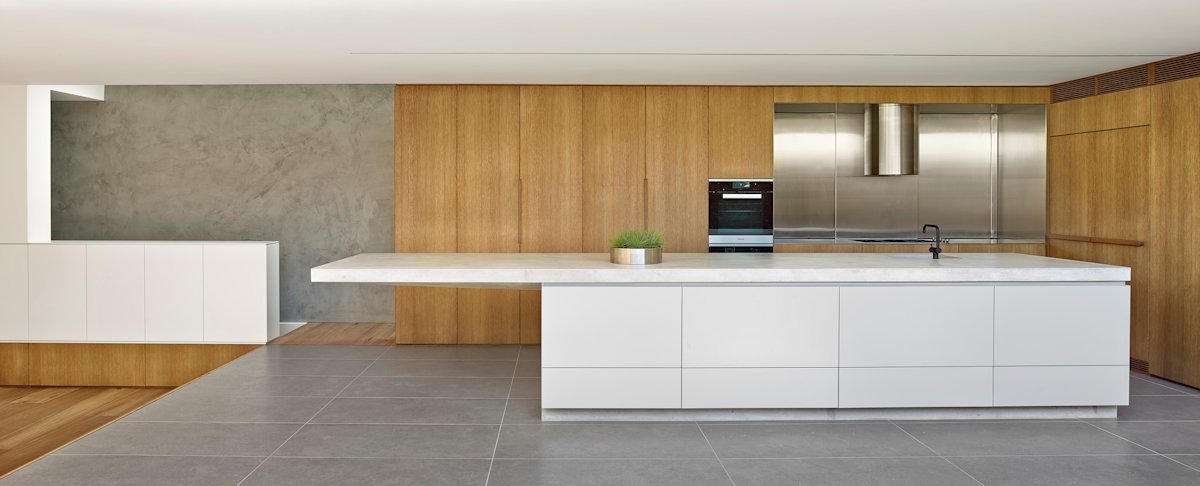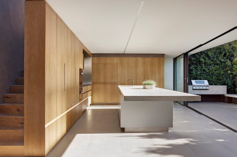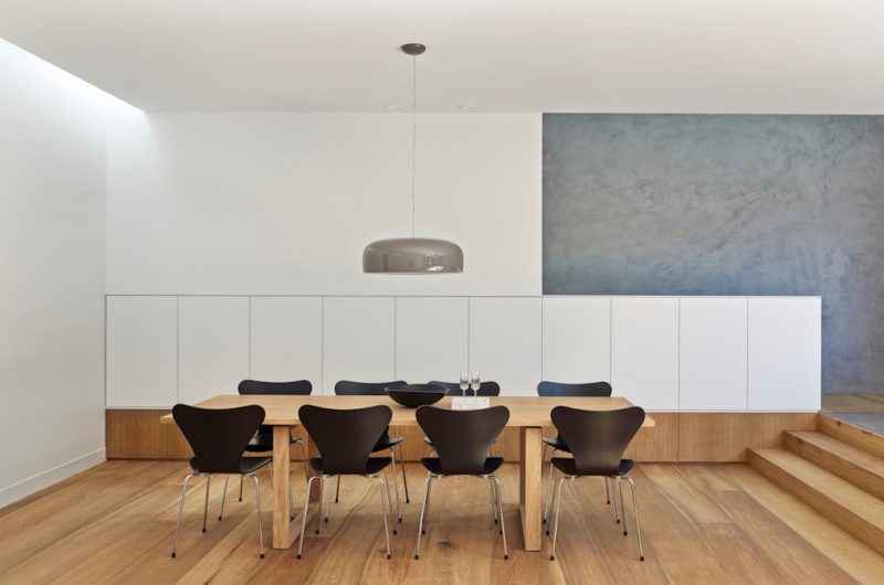 The stairs were replaced with a new elongated stair spine along the southern boundary connecting the three levels. Joinery wraps under and over the stair filling the cavities with much needed storage space. The stairs are bounded by a smooth concrete stucco wall which disperses shadows and light from the glazed roof overhead.