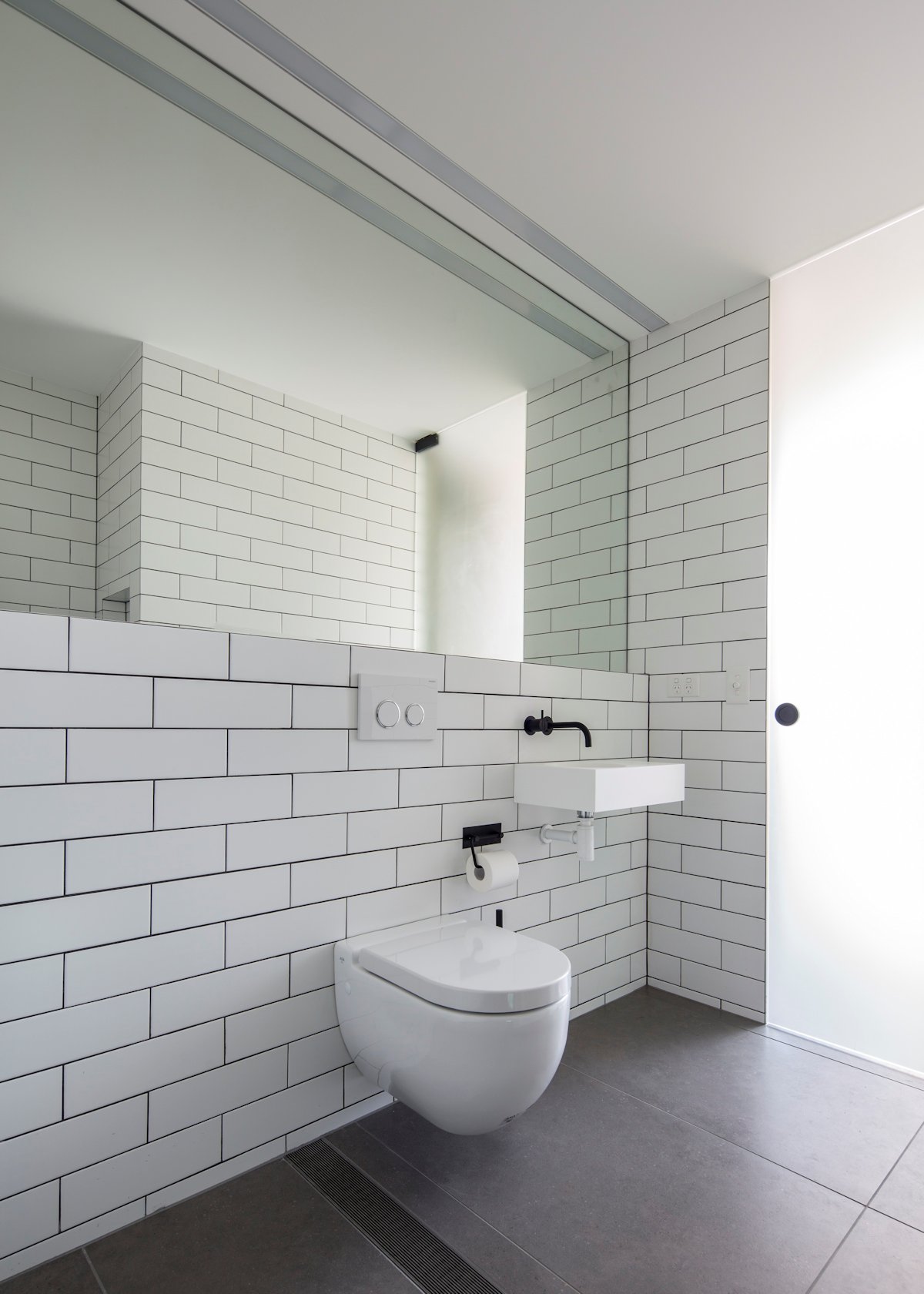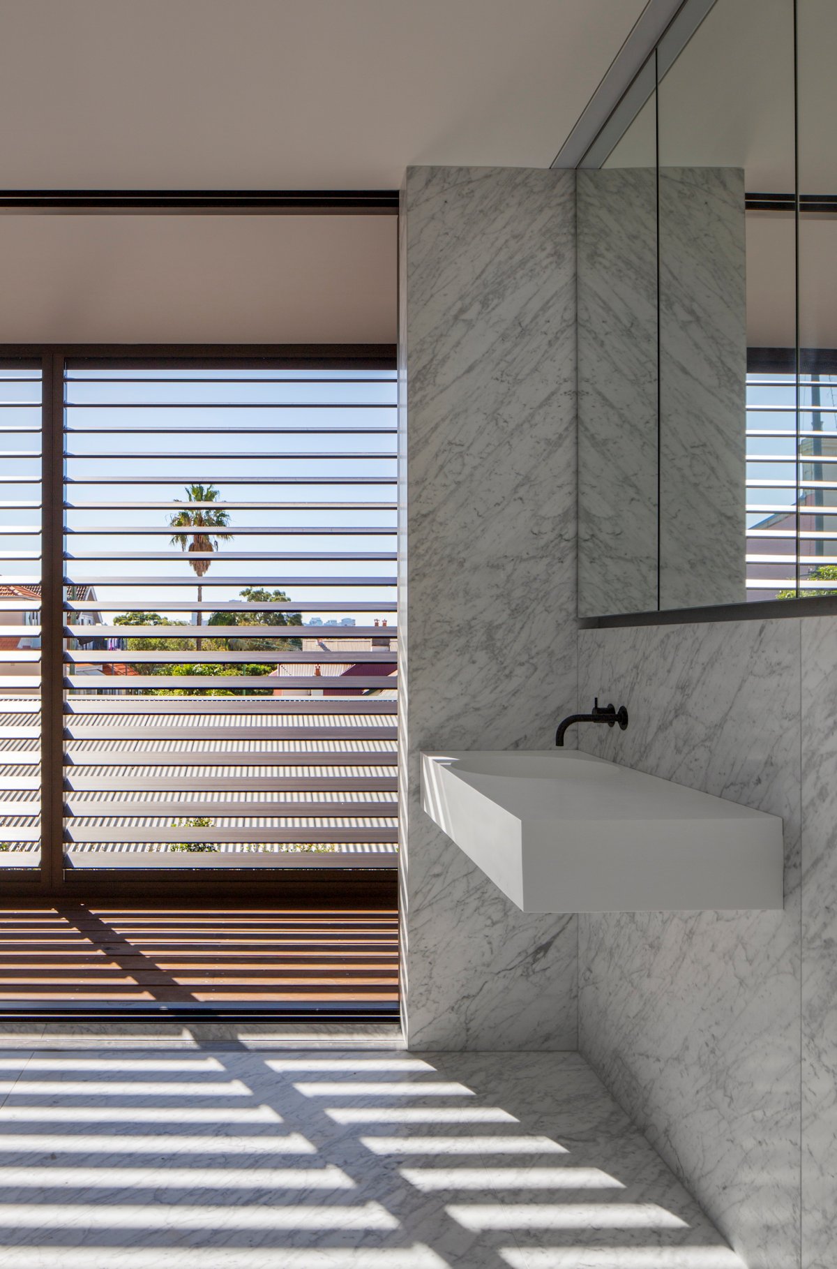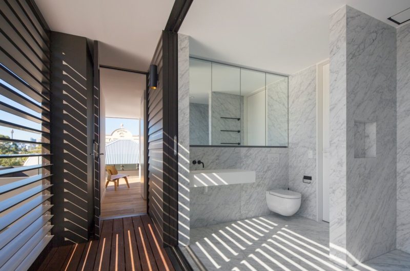 The main bathroom spills out onto the upper balcony, the doors completely retreating within the wall cavity, creating a private outdoor bathroom experience.