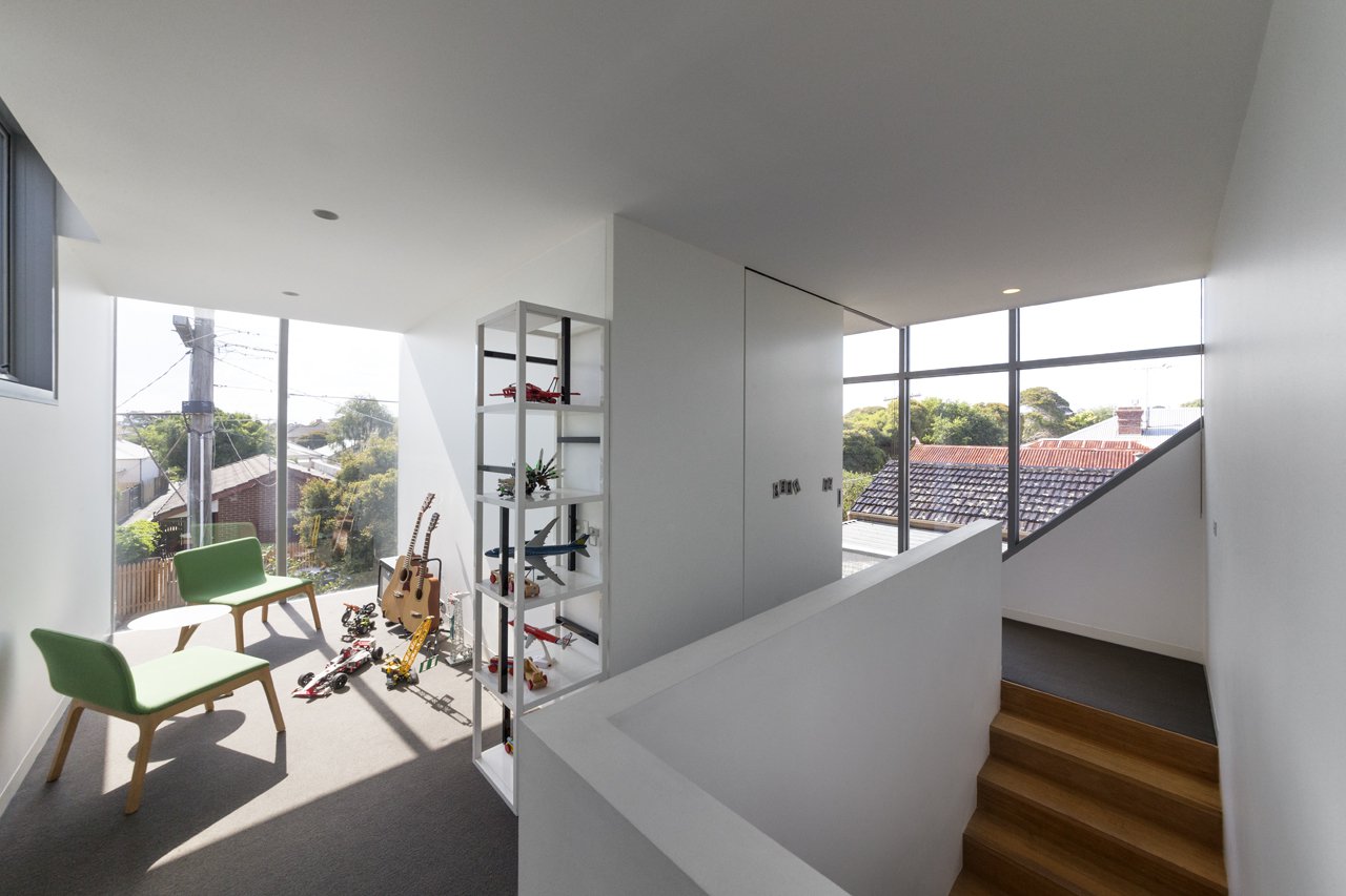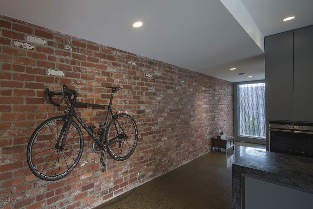 separate lounge or bedroom, while the 1st floor space can also be used as a play space or study, depending on the needs of the family at different times. A home office is also incorporated at the end of the brick corridor space, which can be used by either the parent working from home or as the childrens computer area. A shed is carefully concealed on the south of the building, accommodating more bikes and tools for bike builds.Every millimetre of space has a purpose, although the spaces are flexible enough to change as the family dynamics change over time.