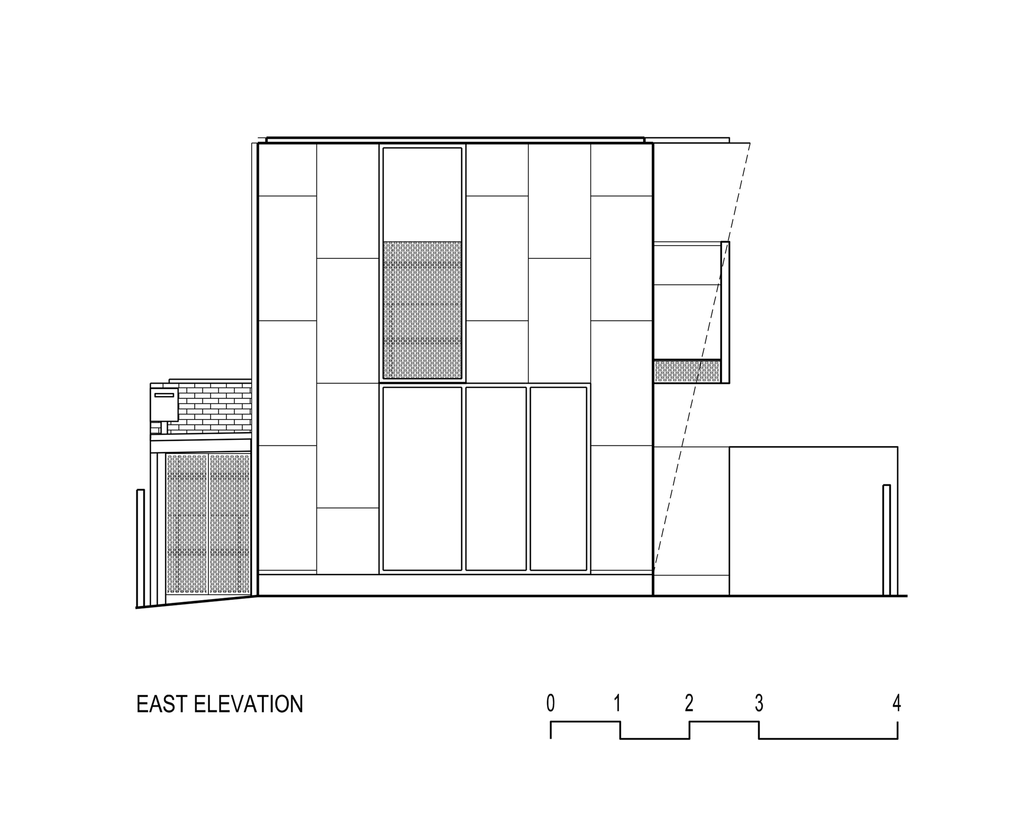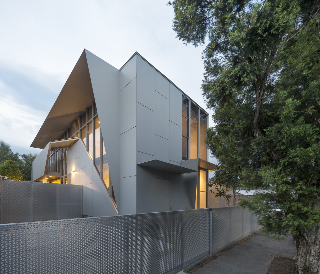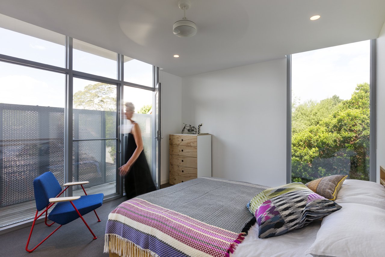 The strategy was to design a simple cement sheet box with elements which folded out of it to create shading devices and privacy screens where required. The fence unravels itself from the building, folding down from the entry canopy onto the street then winding around to conceal the bin enclosure. Triangular perforations in the fence aim to deter the local graffiti artists as well as allowing light to penetrate. This material is also used as a privacy screen on the 1st floor to prevent overlooking into neighbours’ properties.