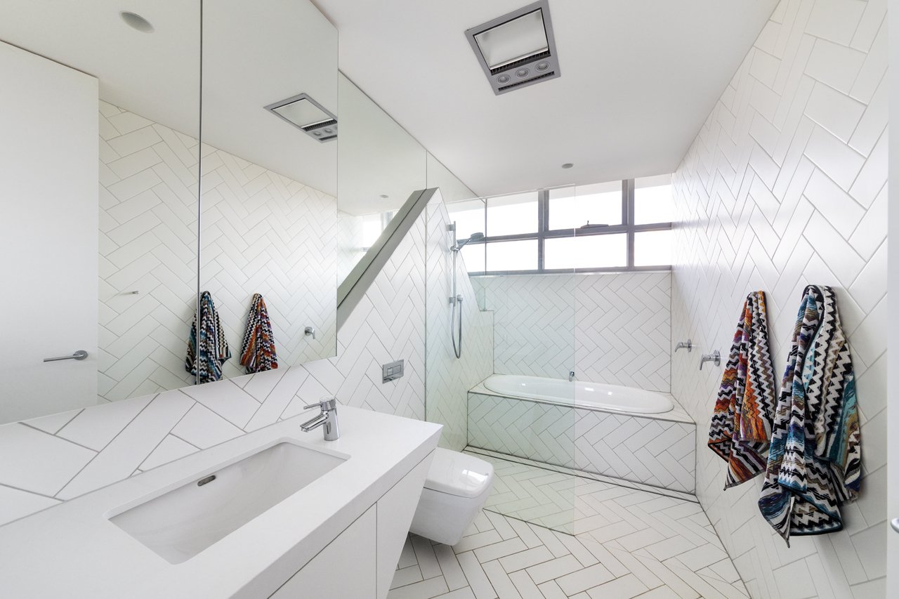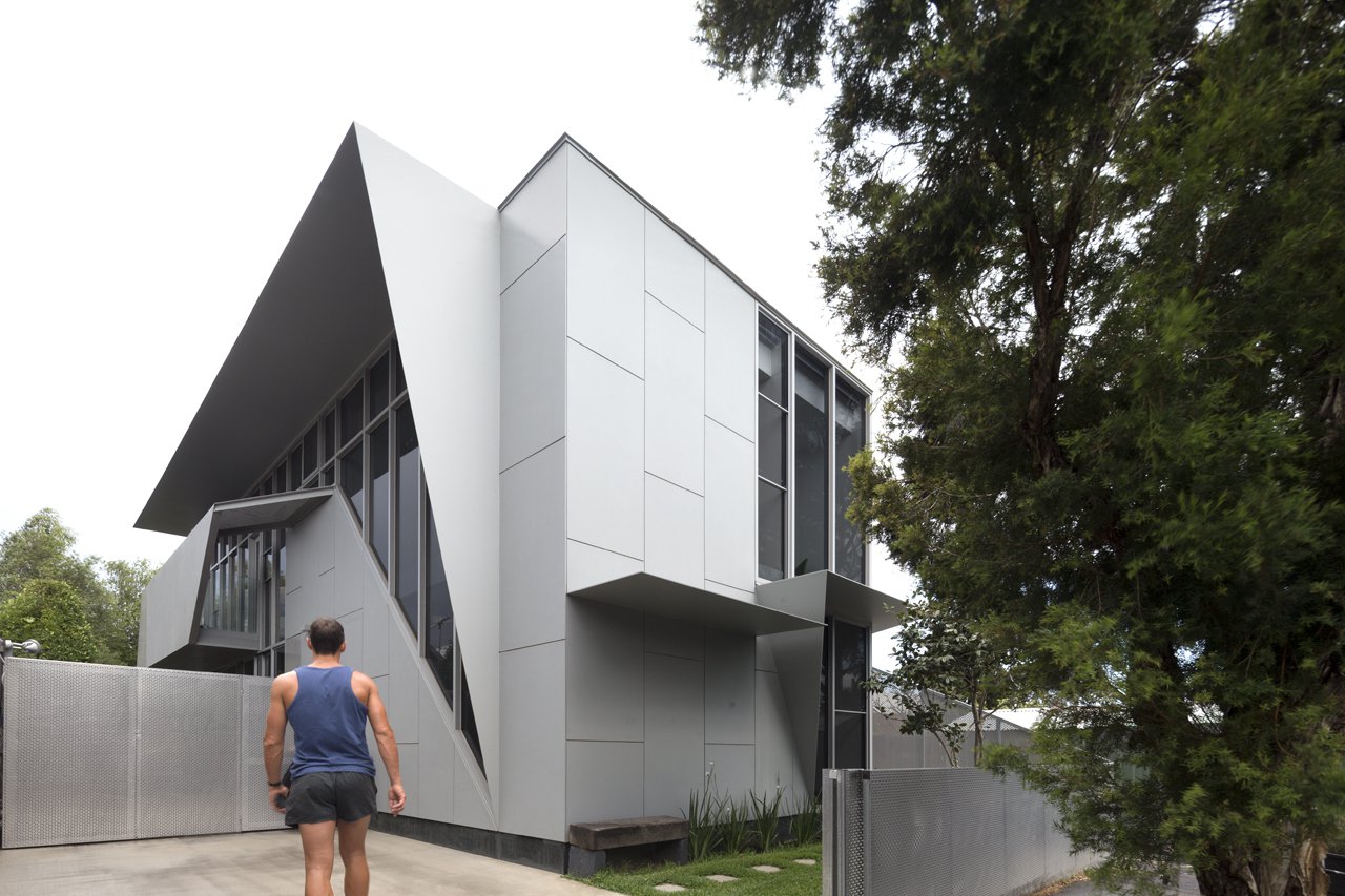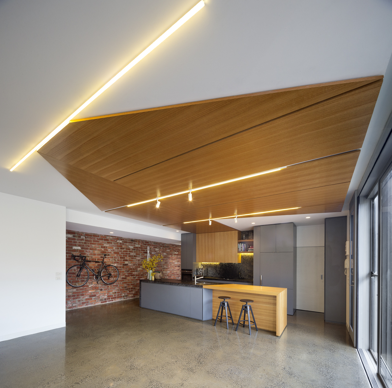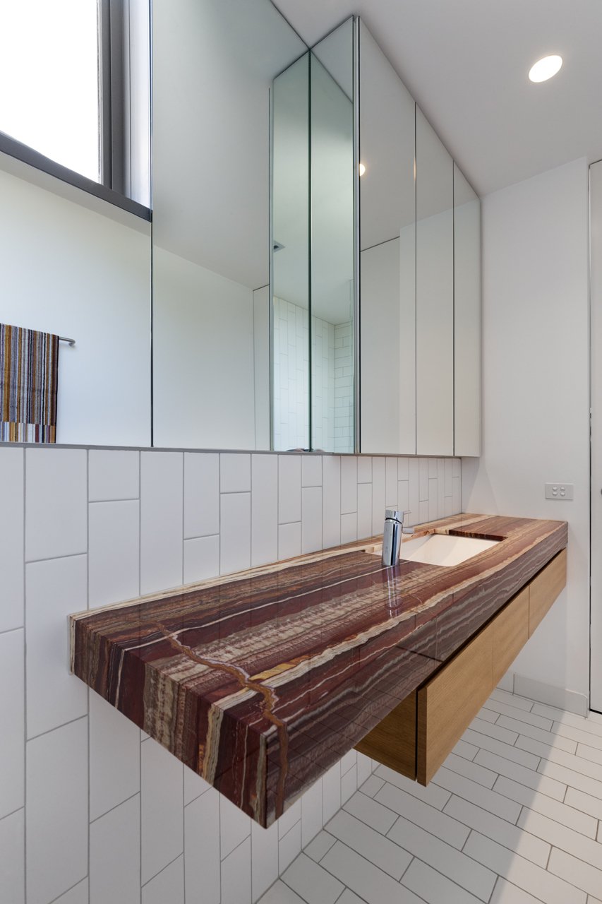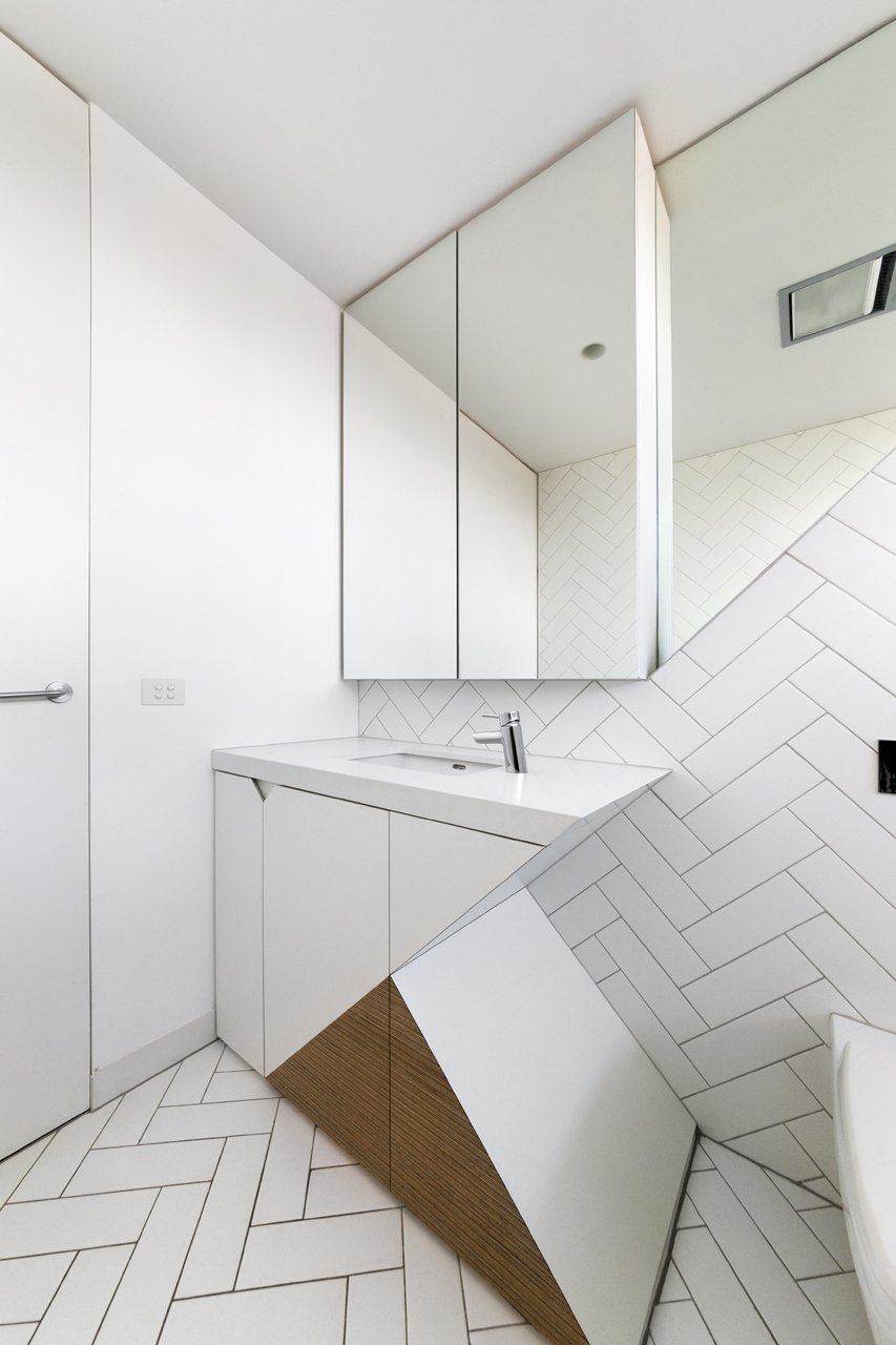 While the appearance from the street is a pristine grey sculpted box, in contrast, the interior is rich with texture and colour, reflecting the active life of its users. A simple palette of exposed brick, concrete slab, local timber, ply and laminate are used internally. The unfolding continues in the interior with the Kitchen ceiling wrapping down to become the cabinetry. Stone and timber are spliced together, imitating shadows cast by the canopies externally. Spaces fold and twist over themselves, in both the joinery and tiling, responding to the stretching and folding occurring on the façade.
