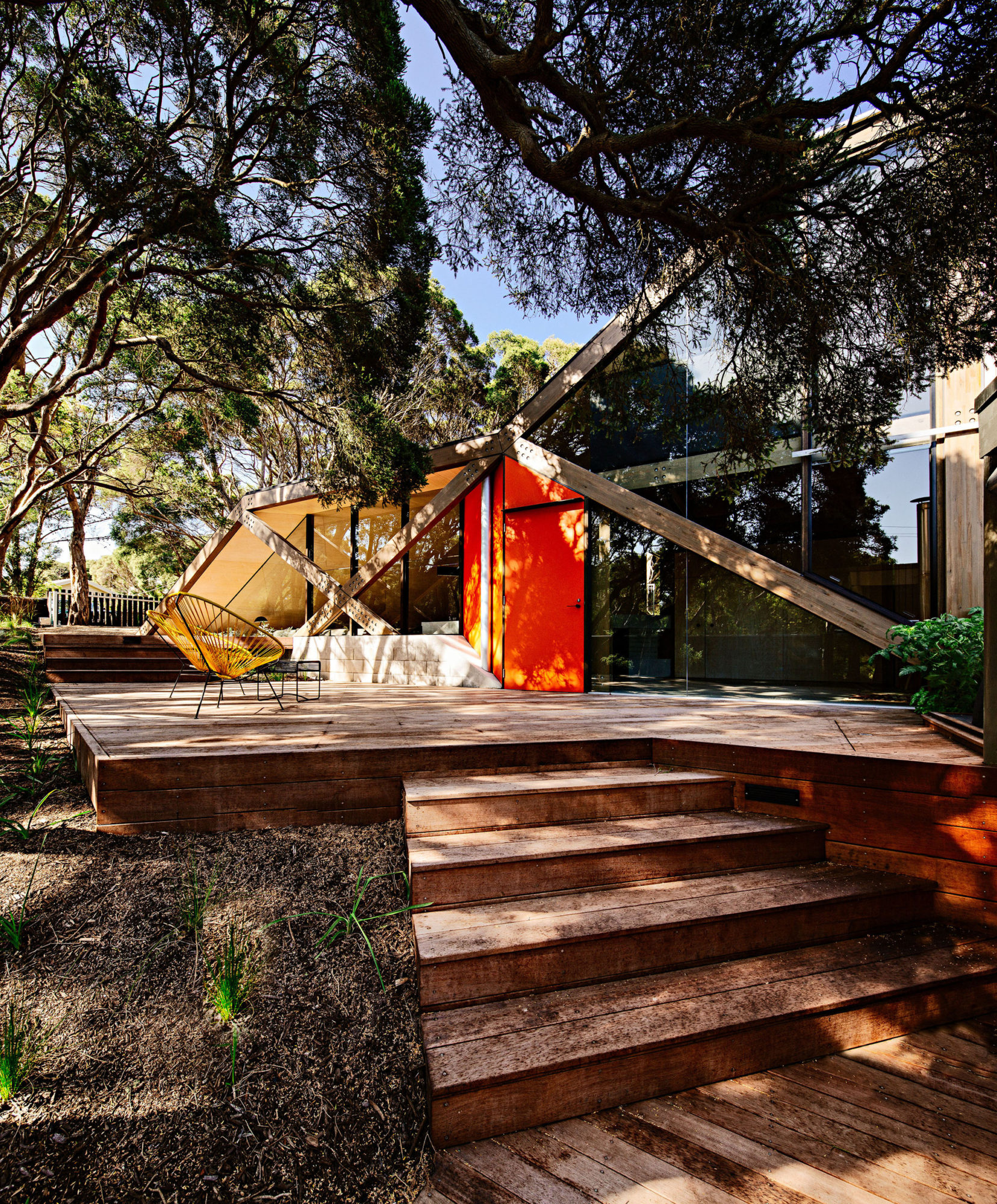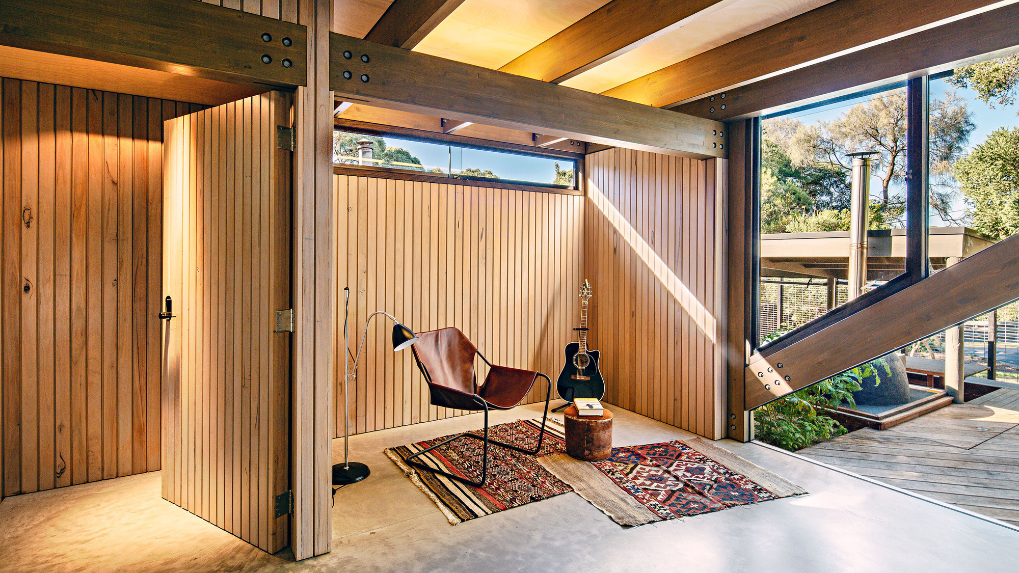 Cabin 2 is an extension/addition to an existing 1960s log cabin located in bayside Blairgowrie. The surrounding coastal Moonah woodland forgivingly hides a suburban-like density of houses and network of winding roads free of formed kerb, gutters and footpaths. Many of the houses are holiday homes and there is an accompanying high level of development activity.