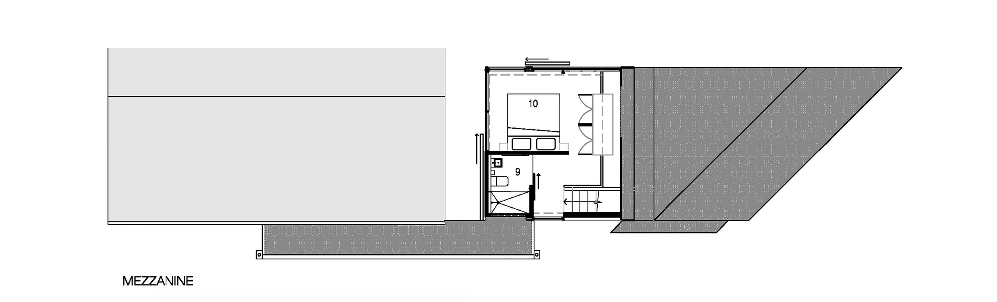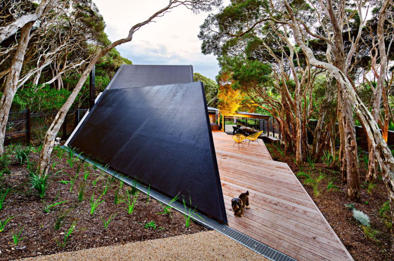 The existing cabin has two bedrooms, a bunk room, kitchen/living area and bathroom. Cabin 2 provides a new bedroom and ensuite at mezzanine level, a ground floor living space, kitchenette & concealed study and additional northern deck area. The new architecture is informed by and embedded into the landscape. The folding roof grows out from the topography to act as a new type of landform. This bituminous membrane wall/roof plane and its supporting pre-fabricated skeletal timber frame appear influenced by the prevailing wind forces shaping the surrounding contorted Moonah trees.