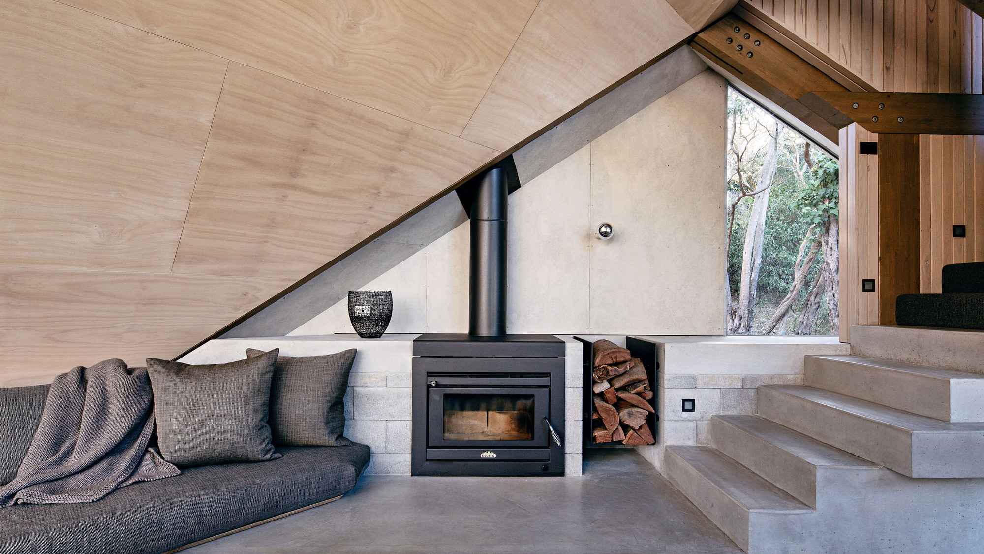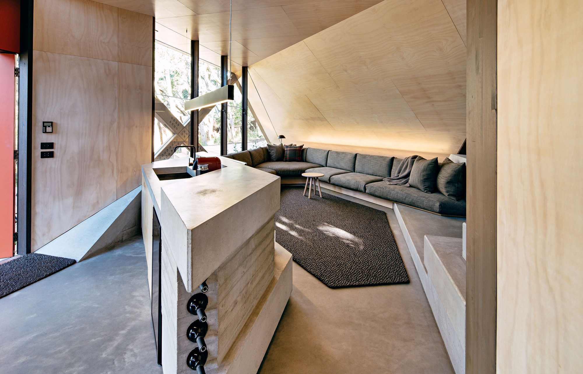 The monolithic concrete plinth is part sunken into the land in an attempt to emphasise a feeling of refuge and physical engagement with the site. The in situ concrete application also enables a seamless integration of the kitchenette, half of the stairs and the fireplace hearth, as well as providing an external seat and integrated linear planter.