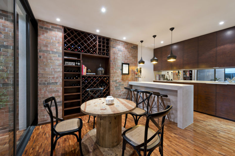 Inside, the main living areas are well lit and beautifully decorated with art pieces and natural plants. The kitchen features a mix of rustic and modern elements such as an exposed brick wall, wine storage facilities and high-end appliances. The first floor is reserved for socialization, which is why it includes the living room, the kitchen, an entertainment room and a studio, while the second floor comprises the private areas such as 2 bedrooms, a guest bedroom, a TV room and the main bathroom.