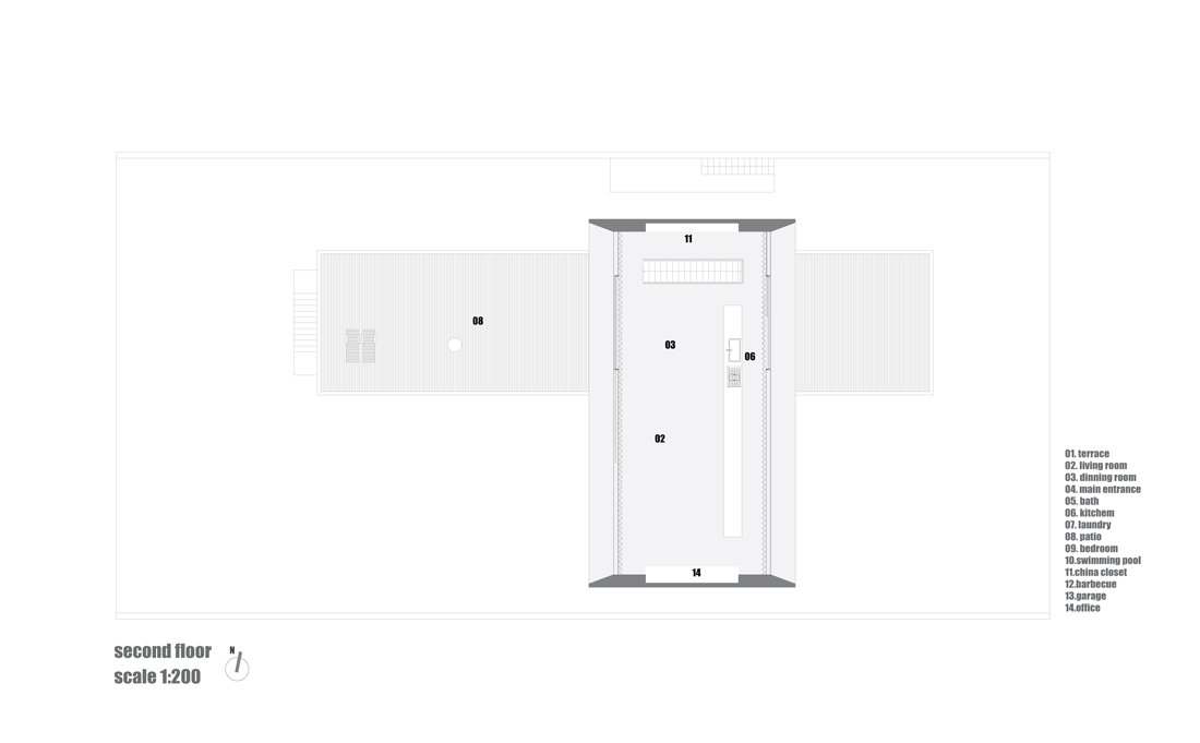 The upper floor is organized in a prism of glass and concrete and is supported by stilts. The living room is in spatial continuity with the kitchen, separated only by a table used to prepare the food. All of the equipment and furniture of the kitchen are available on this table, in order that nothing vertically interrupts the visual transparency of the volume. On the roof of the ground floor, connected to the living room, the garden terrace extends the external area.