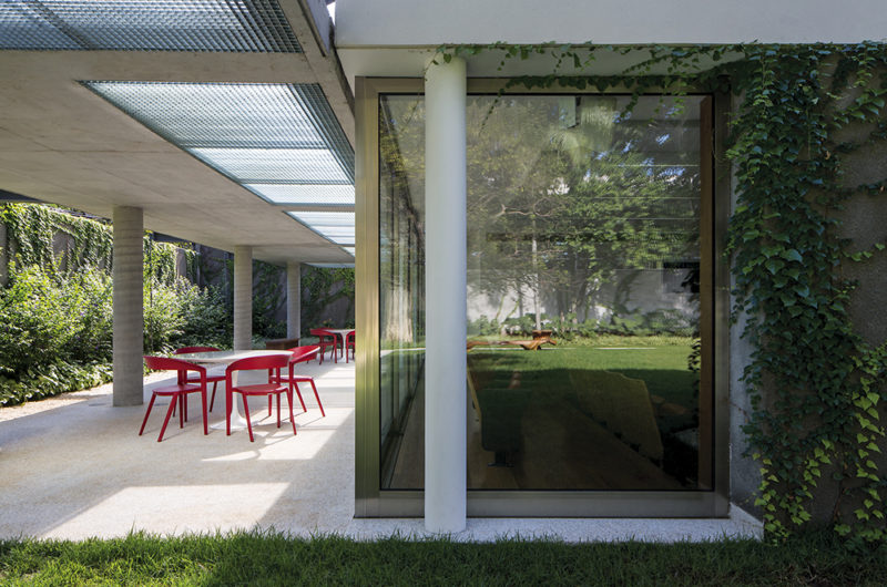 The house features a mix of old and new elements that coexist harmoniously and complement each other. The exterior floors are made out of sturdy granite, while the interior ones are made out of wood. The workstations are the only areas that have carpets, a choice that was probably made in order to add a cozy touch to the work-dedicated areas. In order to ensure utmost acoustic comfort, the architects decided to use plaster lined acoustic plates in the auditorium. The upper floor flaunts impressive views of a green garden that covers the two new marquees while ensuring thermal comfort and motion control.