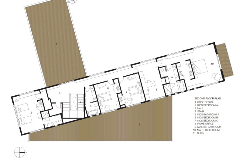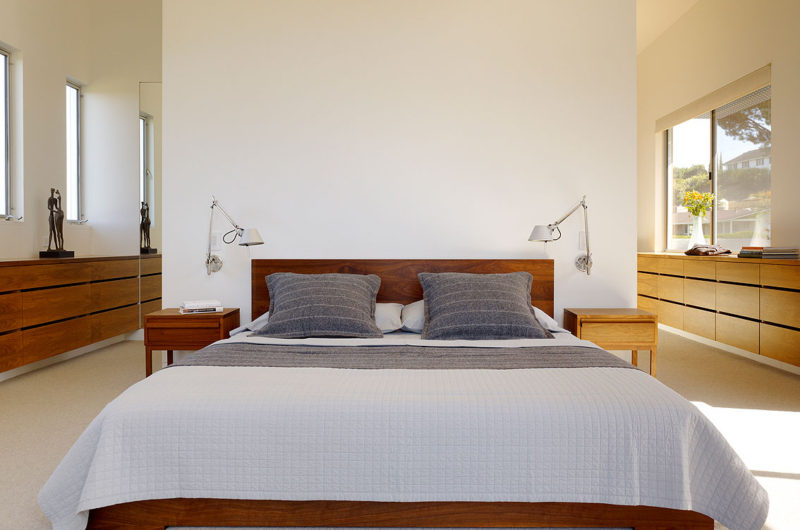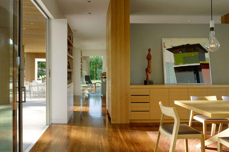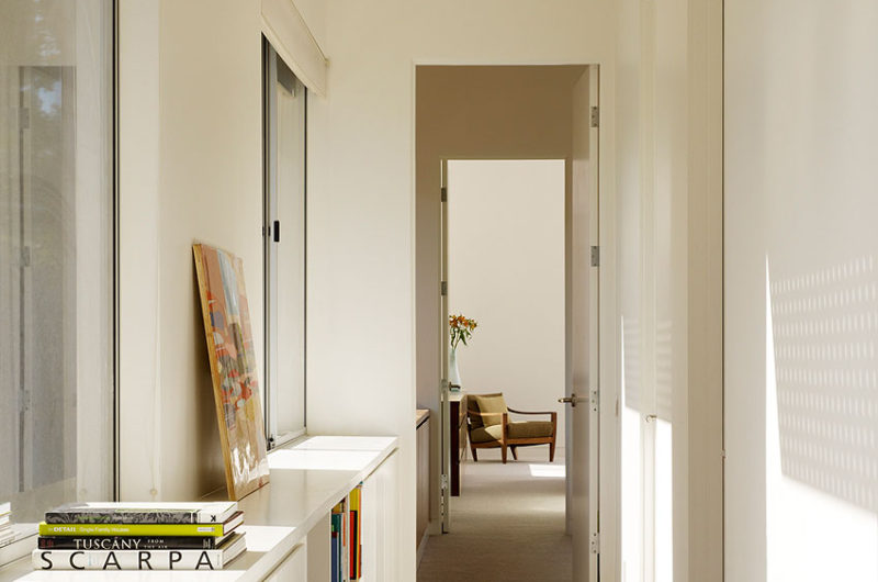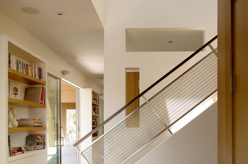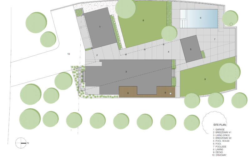 It was built for a family of five, on a one-acre lot, and it is broken into three different parts that are separated by two breezeways. The main structure is shaped like an L, and it includes the garage and the main living areas. The second floor is clad in cedar and it houses the four bedrooms of the house. The pool house is located under the north end of the second floor, separated by the living area by a breezeway.