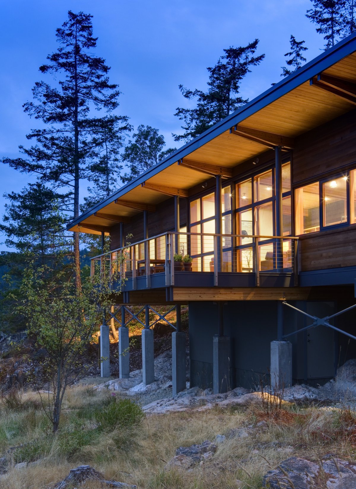 Located on Cortes Island, British Columbia, the Cortes Residence is sited on a granite cliff face that serves as a wind break for Cortes Bay and the Seattle and Vancouver yacht clubs. To the south, the house is exposed to the Straight of Georgia which delivers 100mph plus winds and salt spray during winter storms. To withstand the winds, the house structure is embedded into the bedrock with cross braced steel columns and exposed floor beams allowing the house to cantilever gracefully off the hillside.