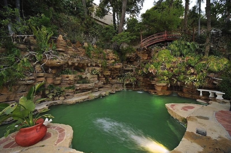Its location makes it look like a double gated fortress where security is essential. Between the two guest houses there is a lagoon-style pool with waterfall joined by a beautiful landscape and small bridges over the water.