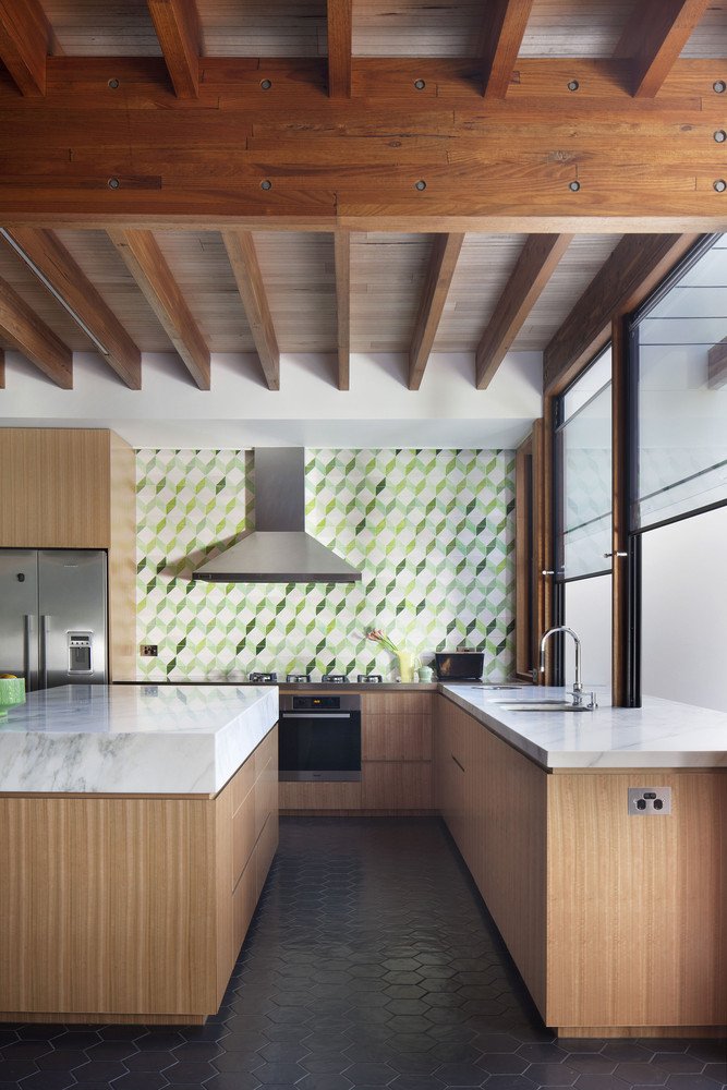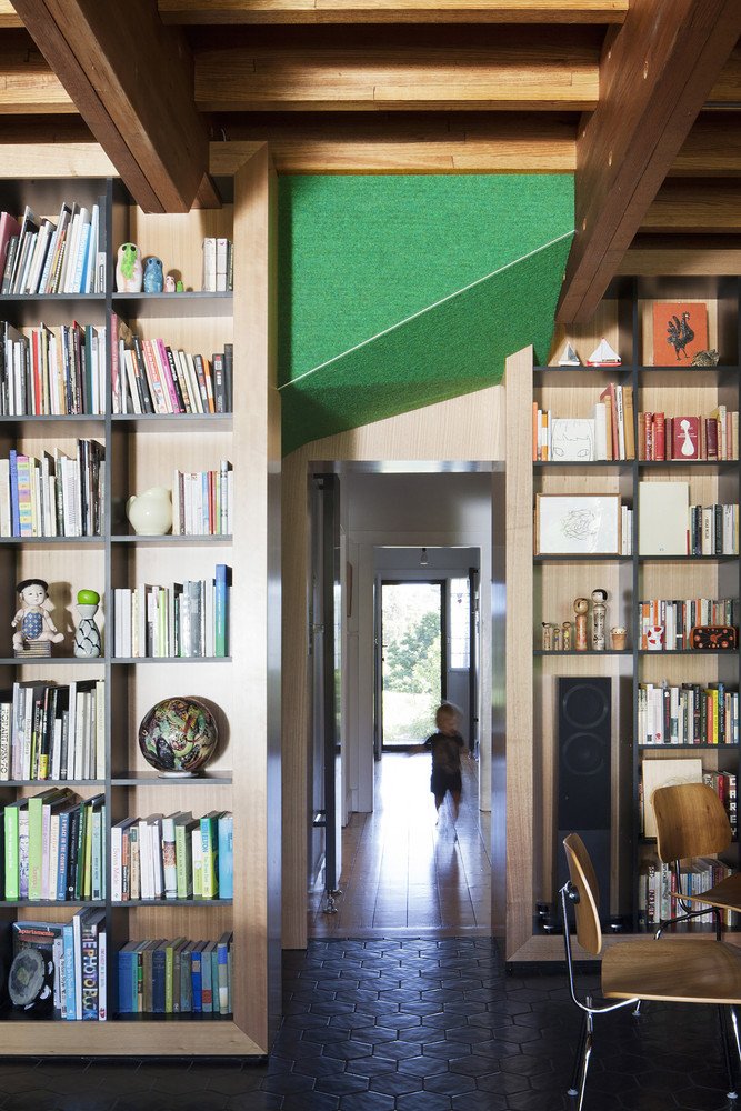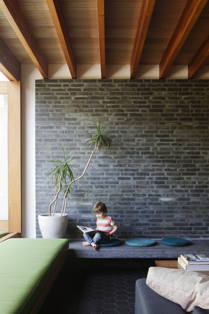 There is a nostalgic reference to the child’s simple drawing of a house in its most basic form, with smoke billowing out of the chimney, a place of happiness and content. The façade is based on the opening credits of the children’s program Playschool where every window is different and provides a portal into some other world. The interior space of the house can be fully opened and extended to the landscape beyond. Materials have been carefully chosen for their ability to demonstrate a level of craft; from oversized exposed timber beams to hand-painted tiles by the owner.