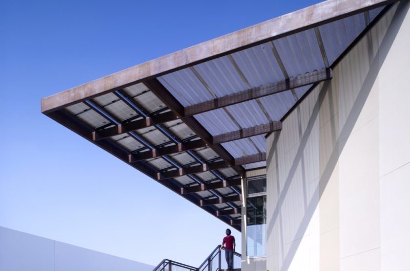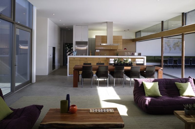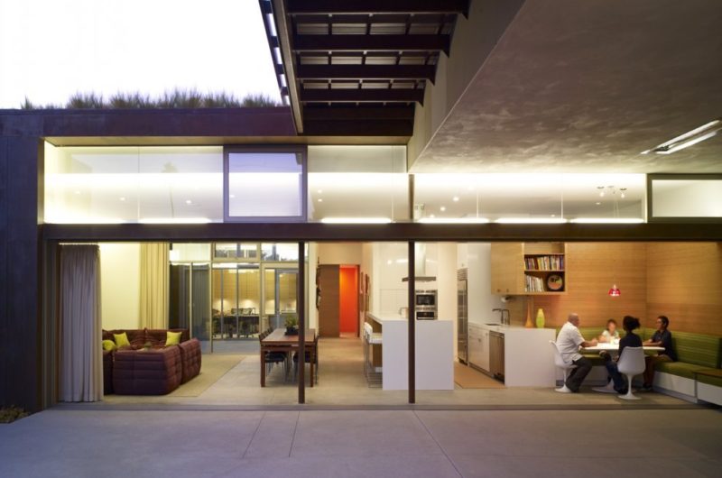 The owners preferred the bedrooms to be smaller in order to have larger public spaces. This home is an eco-friendly building, featuring a green roof, bamboo interior, composite stone, tile countertops, bathroom finishes which are recycled and a solar photovoltaic panel system that provides even shade from the sun in order to protect the house from becoming overheated.