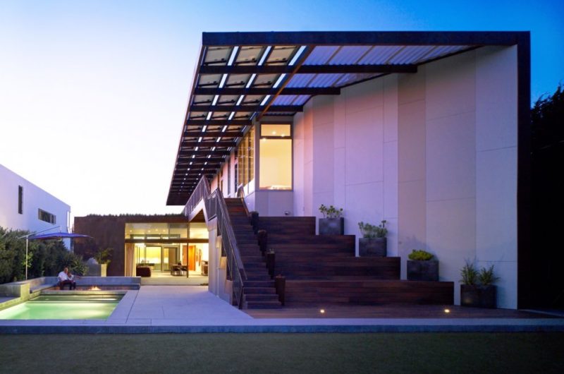 A formal contribution to the design of the structure is given by the scale manipulation, consisting in the fact that from the back, the residence seems to be a single-story volume, illusion supported by the scaled master bedroom window and the outdoor steps which when animated with people shows the fact that is a two-storey home.