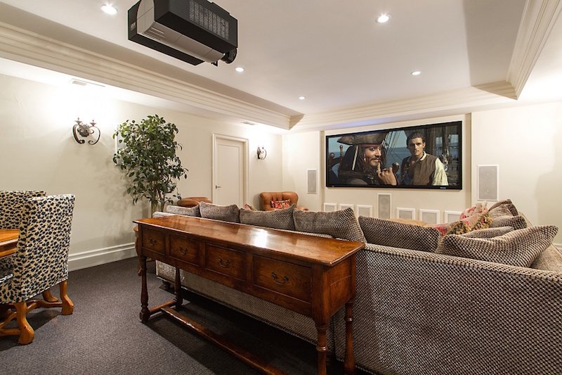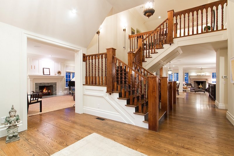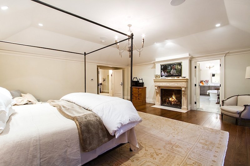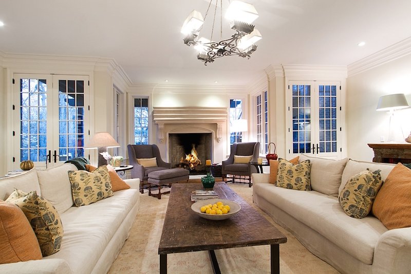 Private living areas comprise seven bedrooms and nine bathrooms. The property also comes with a carriage house and a terrace that can be used to host small gatherings and other social events. The residence features three levels that are connected by an interior staircase with wooden steps and railings. Indoor highlights comprise fireplaces, a piano, small chandeliers, a fully equipped kitchen, a dressing room and a home theater with a projector.
