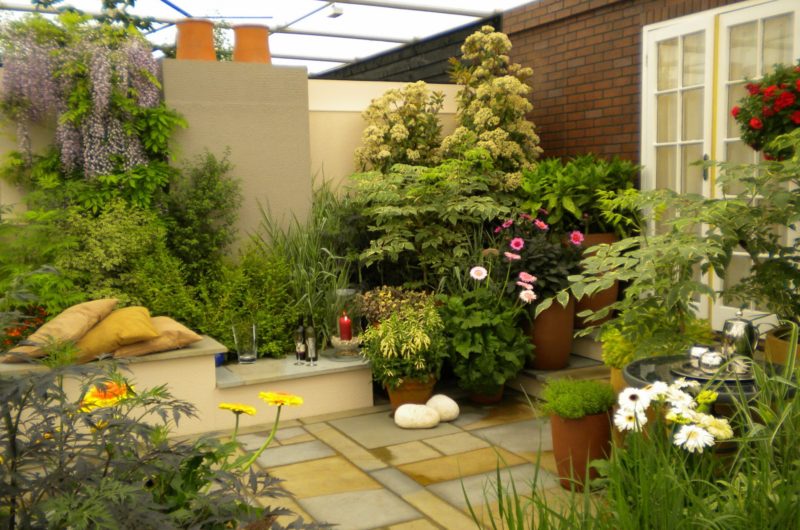 To enliven the terrace, add the color, the freshness and the delicate aroma of the flowers. Place vases with fresh and colored flowers in various corners. Flowers like violets, daisies, begonias and gladiolus will brighten the terrace, especially in the cloudy days.