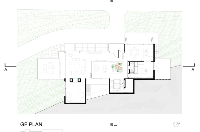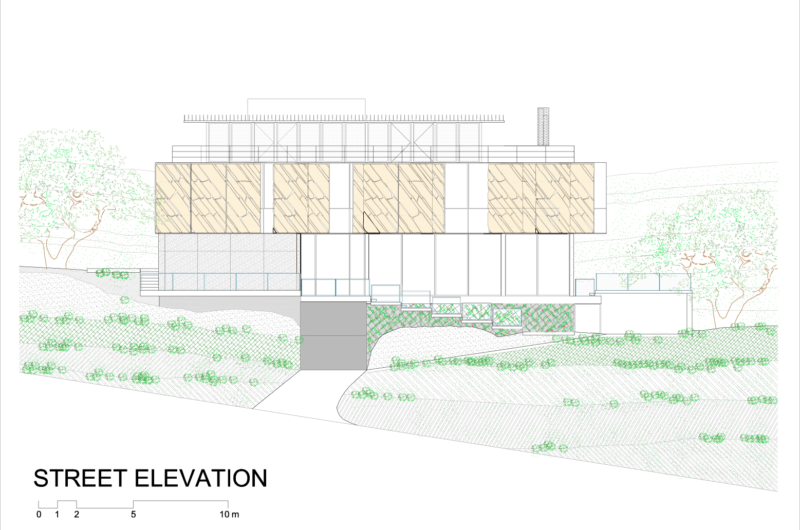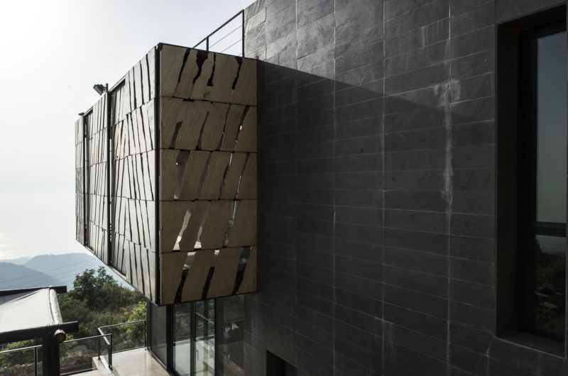 The primary volume that comprises the main living arrangements appears to be floating in mid air, and it features a series of sliding stone panels that allow it to appear similar to the encircling rocky landscape. The floating effect is obtained thanks to a transparent box that includes a selection of platforms, which in turn help connect the street level with the residence itself.