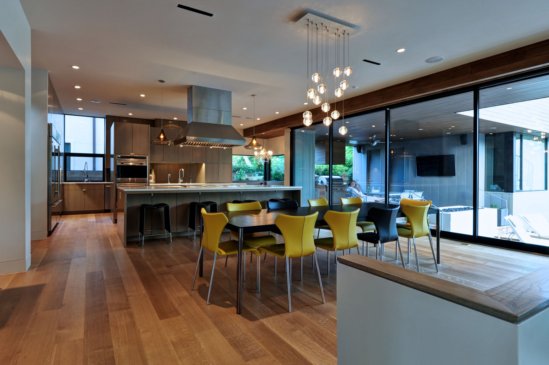 After entering the gate and stepping across a water feature, views of the double island kitchen, interior and exterior living spaces and landscaped yard with a lap pool are afforded through a wall of glass.