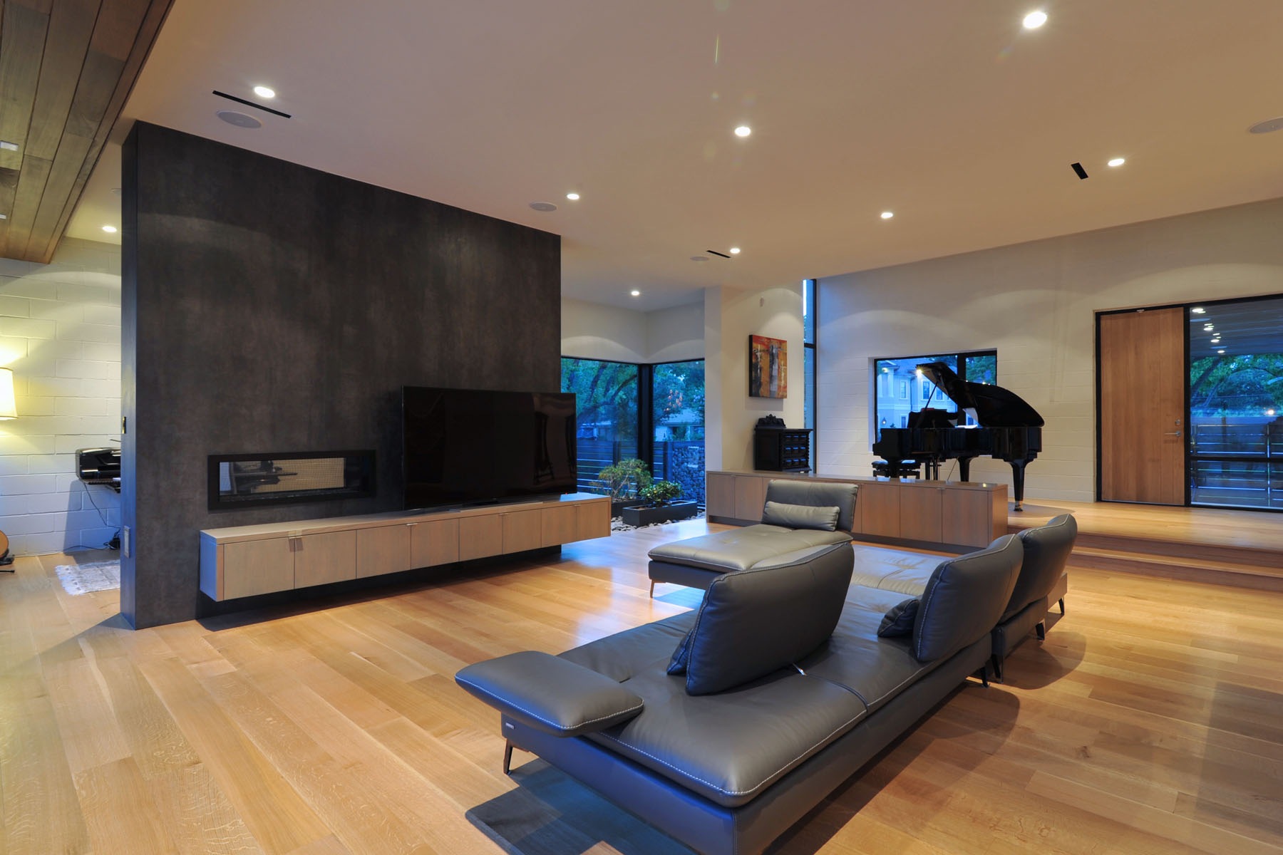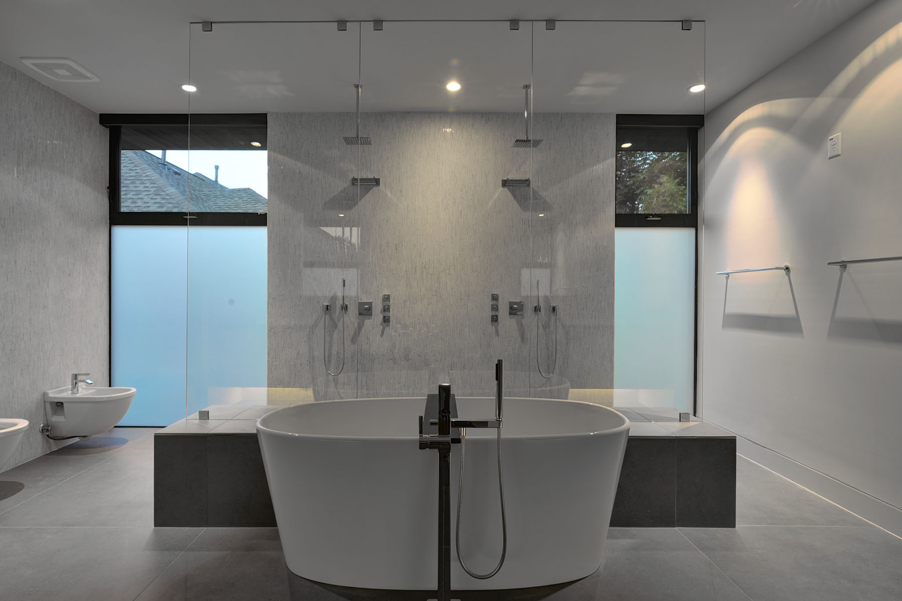Designed for entertaining and family life, the 5,500 sf house includes a master suite with balcony, three bedrooms, a generous family room with a terrace, a garage workshop and a separate guest quarter.