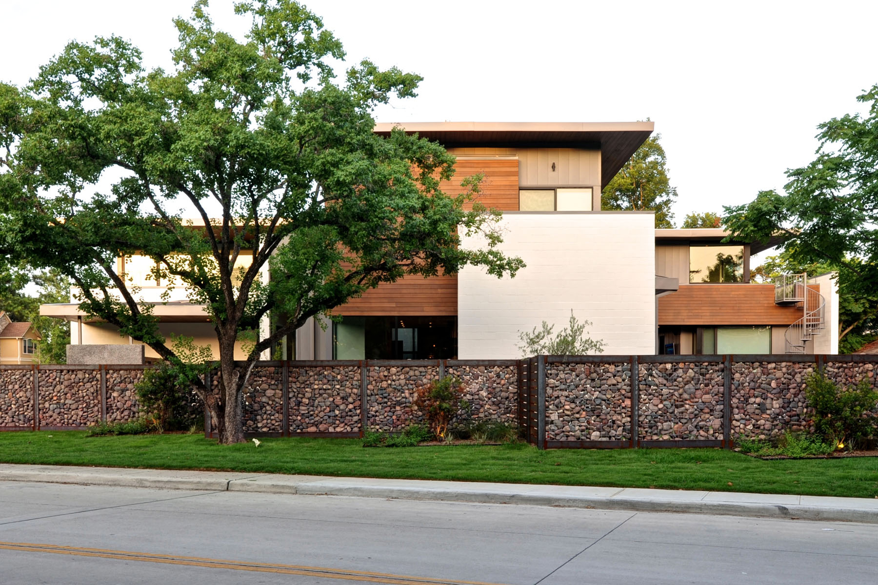 The controlled material palette includes a gab ion wall, metal panels, CMU block, vertical grain cypress, ipe decks, steel and glass. Featured on the AIA Houston Home Tour 2014, Modern Luxury Interiors Texas and CultureMap.