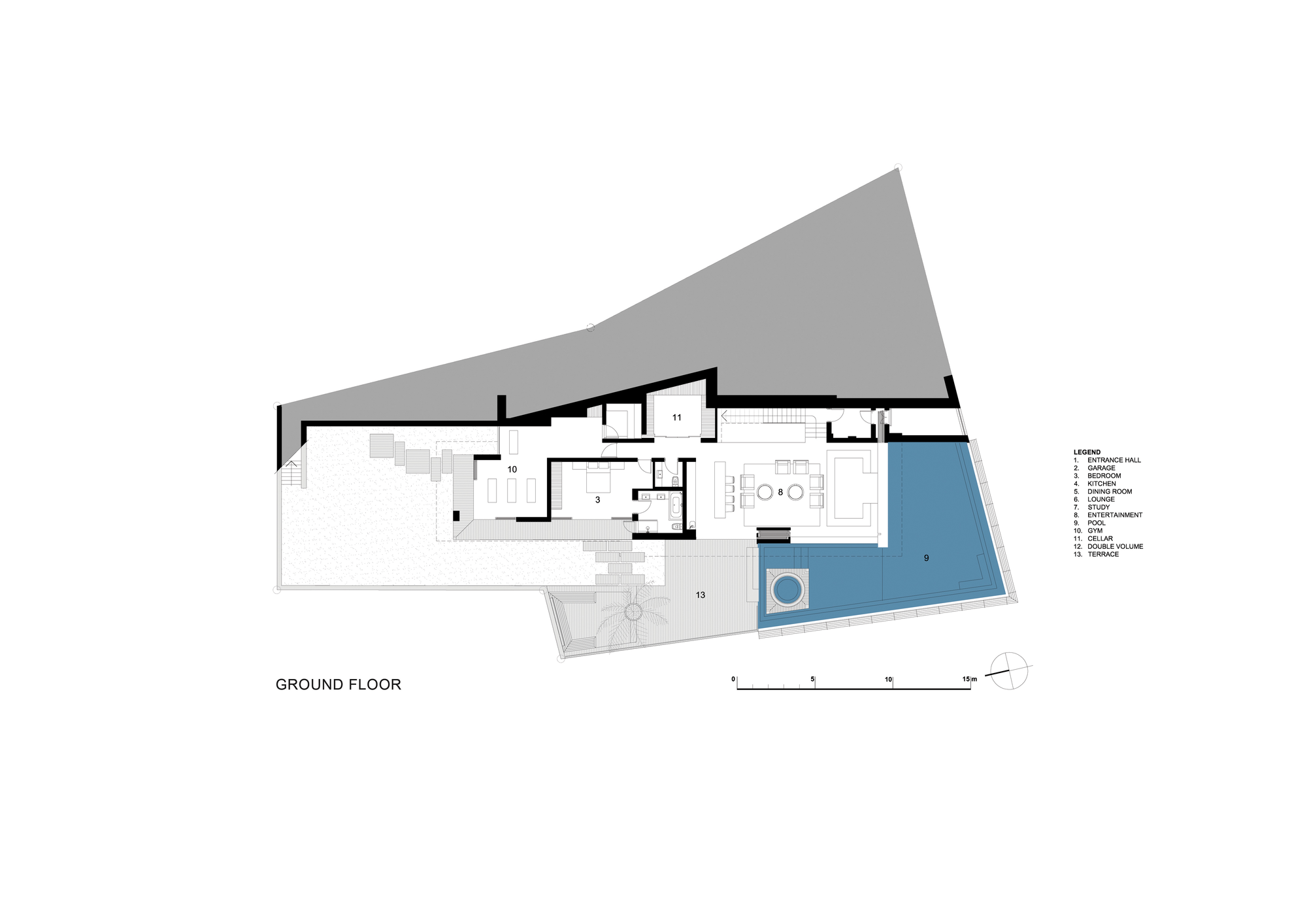 The main living wing of the house includes 2 lounges, a dining room and a kitchen. The ground floor accommodates a large pool entertainment room with a feature sunken lounge, a back-lit onyx bar, a wine cellar, a gym and also a guest room.