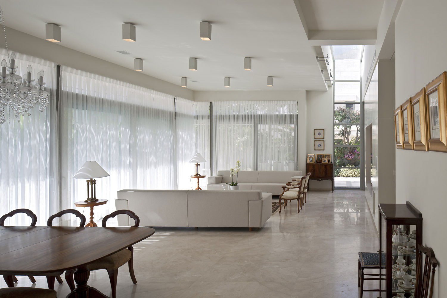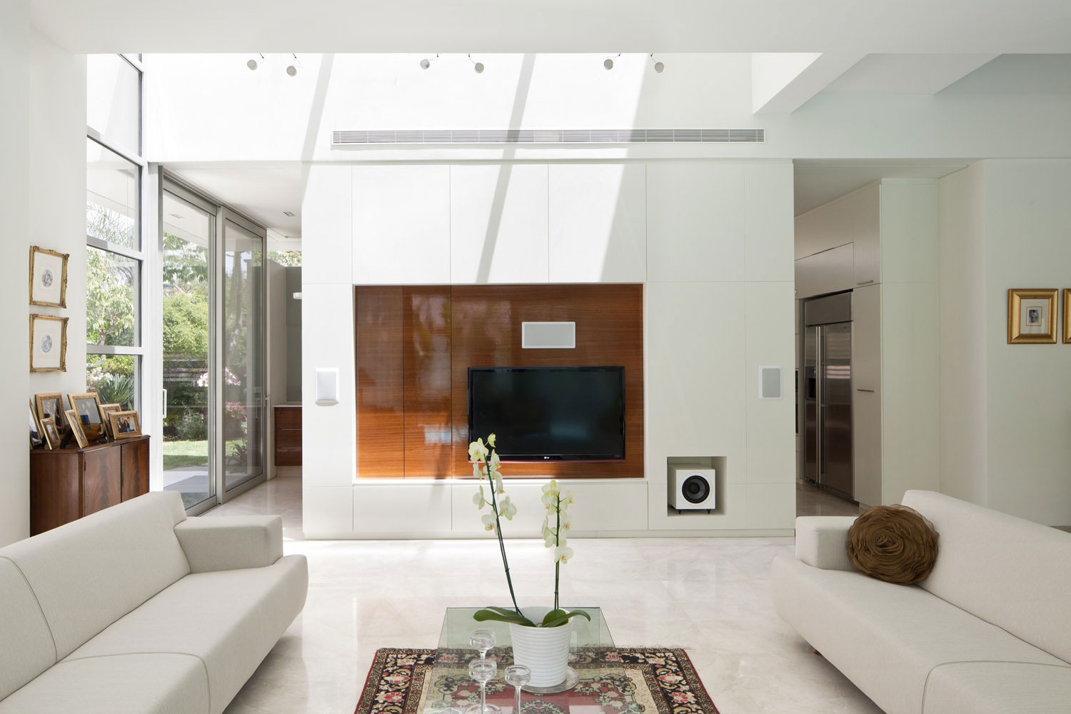 The house was designed for a family with two grown children at the end of a wooded Cul-de-Sac. The neighborhood is dominated by large, introverted houses, but thanks to the unique location of the lot we were able to design a house that can “raise its head” over the wall and look back at its environment without compromising privacy. The house’s layout, orientation and massing acknowledge the sun’s directions and the site’s environmental constraints. Climatic architectural design reduces costs of air-conditioning.