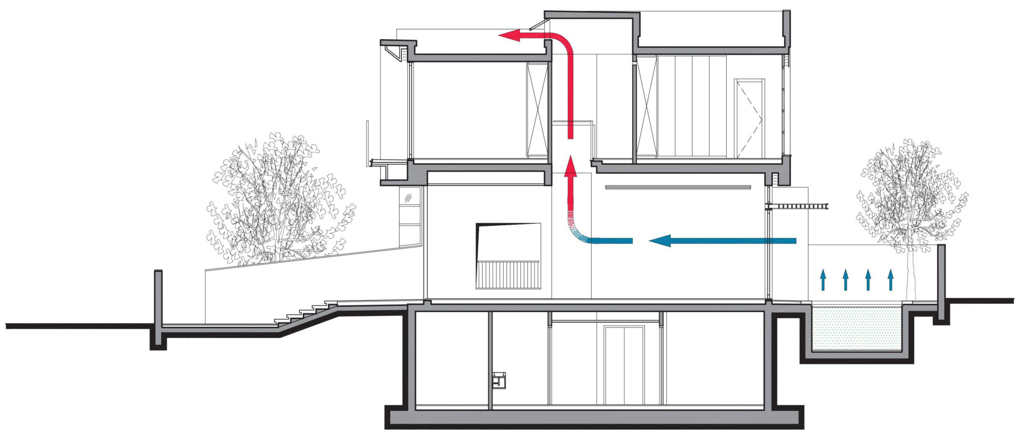 The southern part of this space ascends to a clerestory window in the roof. When open, the clerestory window releases hot air to the roof and generates a natural circulation that allows a flow of cool air from the swimming pool area into the ground floor.