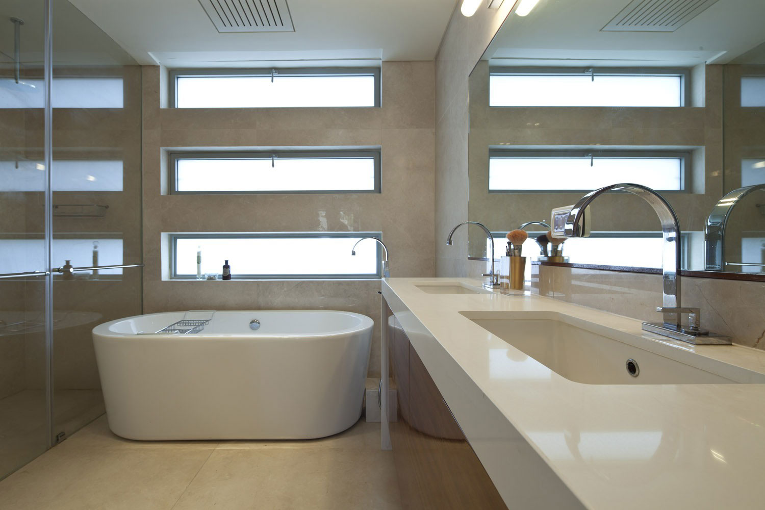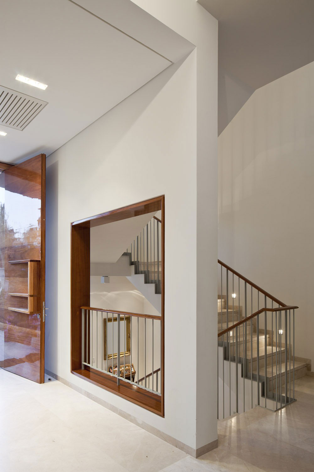 As a buffer between the primary road and the living areas, the architects placed the security room, elevator and parking area at the southern part of the building. Consequently, the bedrooms and the living room benefit from open views towards the west and the north through a series of apertures. On the upper floor, we find the master bedroom as well as the children’s rooms, both of which face a swimming pool and a few beautiful treetops respectively. The two spaces are divided by a double-height area that flaunts a pair of bridges.