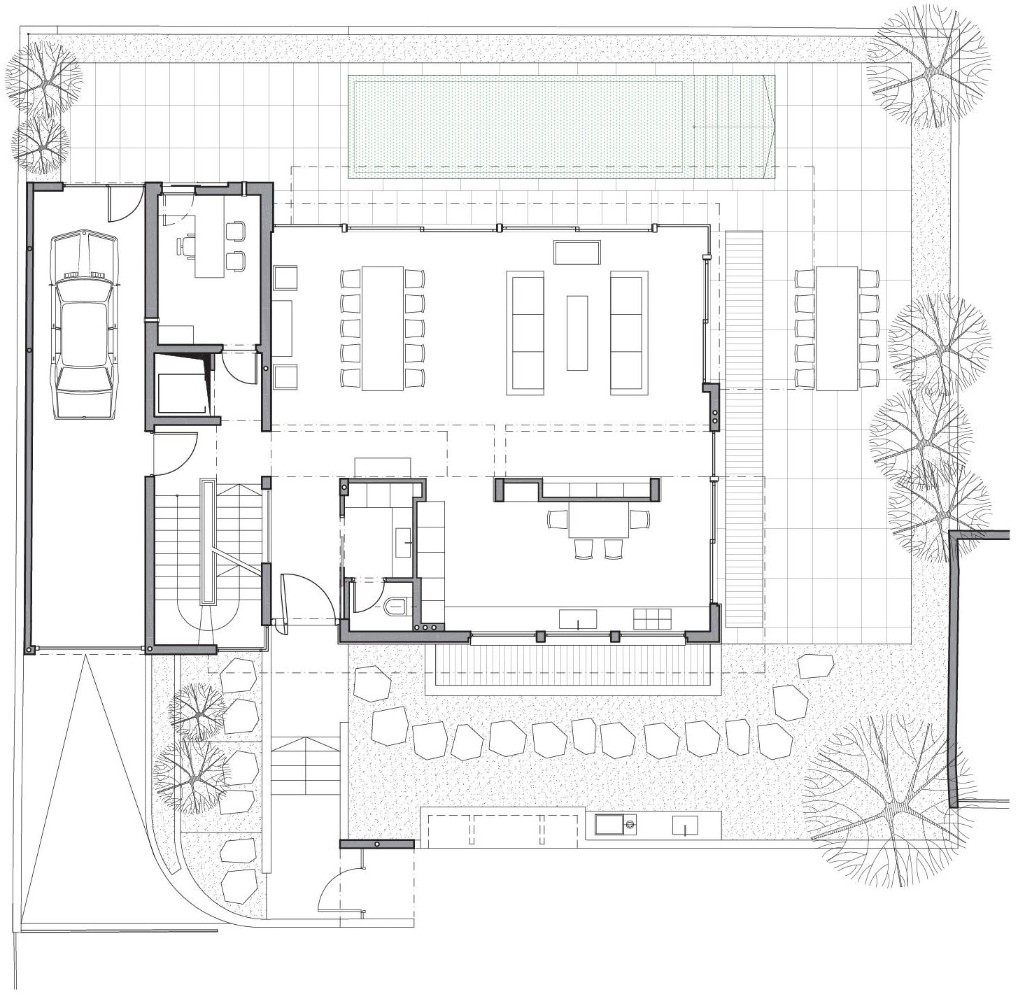 “Heavy” functions such as parking garage, elevator, security room, etc. are lined along the southern edge of the plan and buffer between the living areas and a main road that passes two blocks away. This enables spacious living area and bedrooms with huge north- and west-facing apertures that open to a quiet and shaded garden and swimming pool.