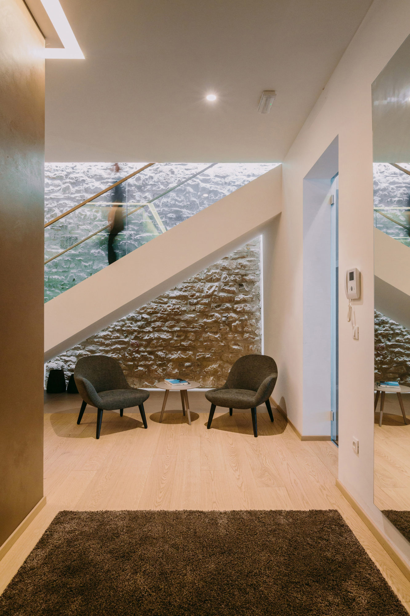 Stairs that connect the two floors are located right next to the old stone wall. Special attention was paid to preserve the walls and avoid any structural compounds. Therefore, the impression is that the staircase is hovering alongside the walls.