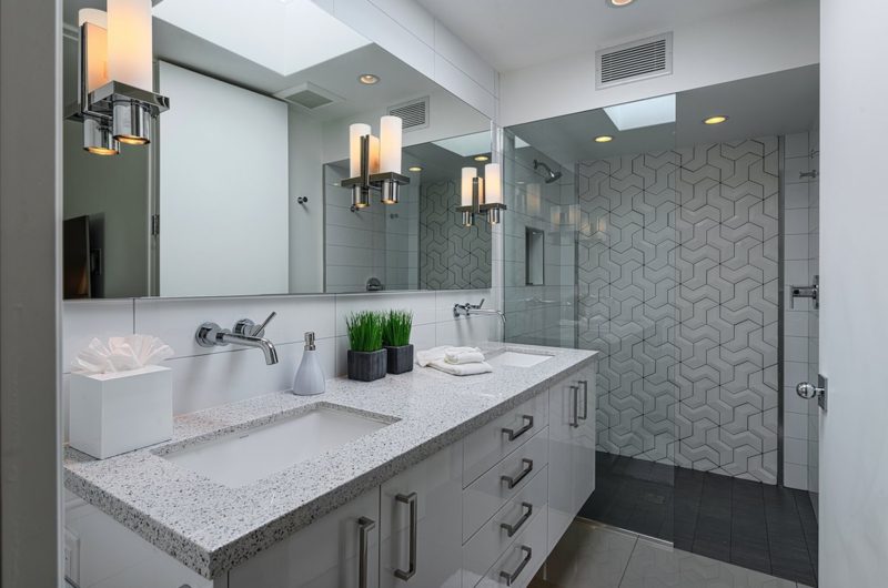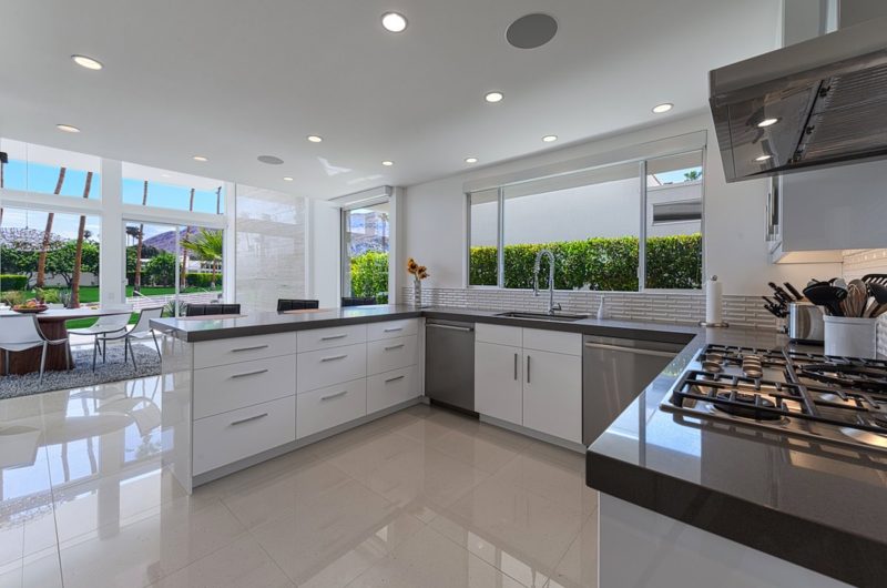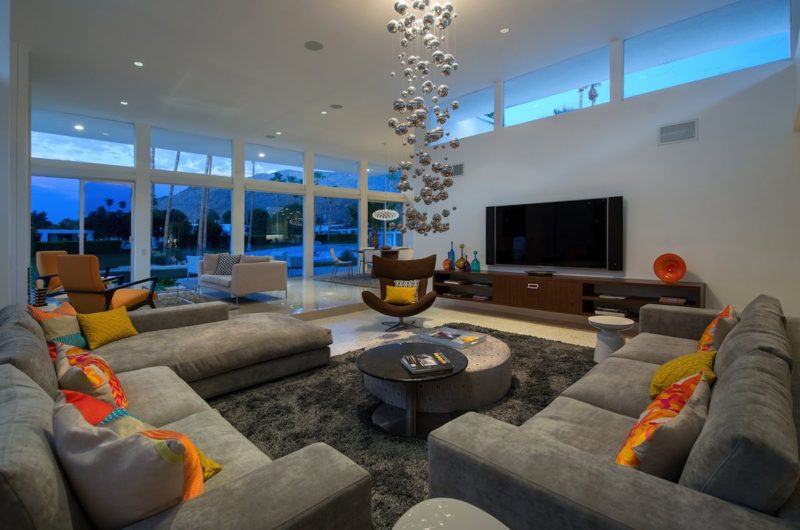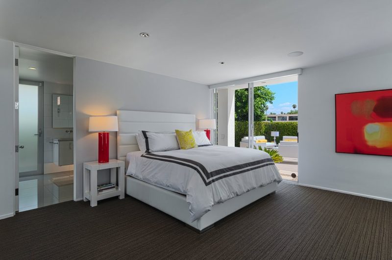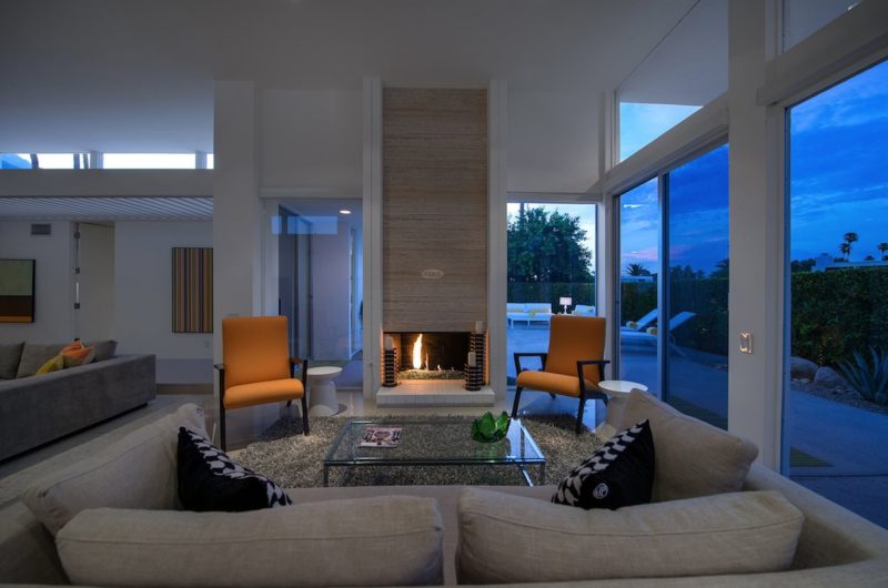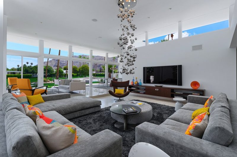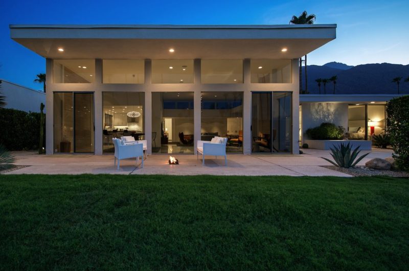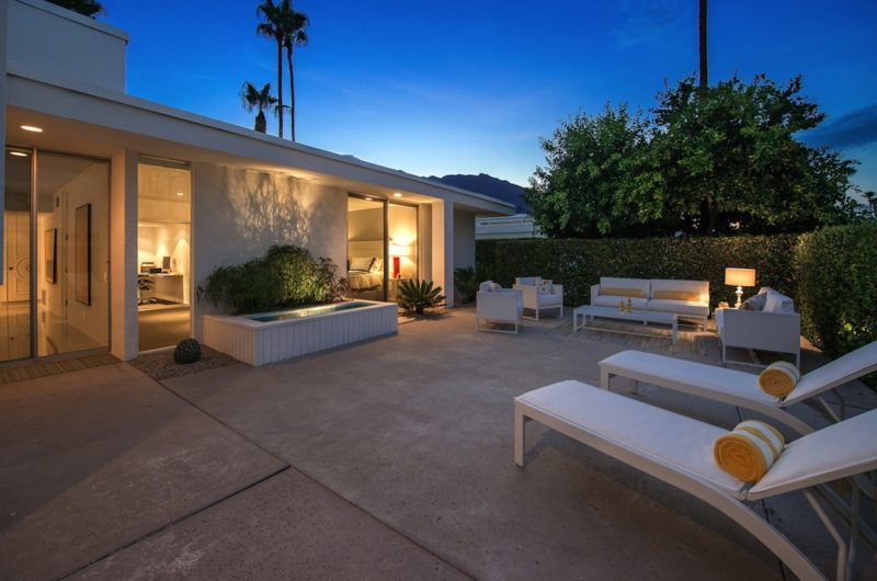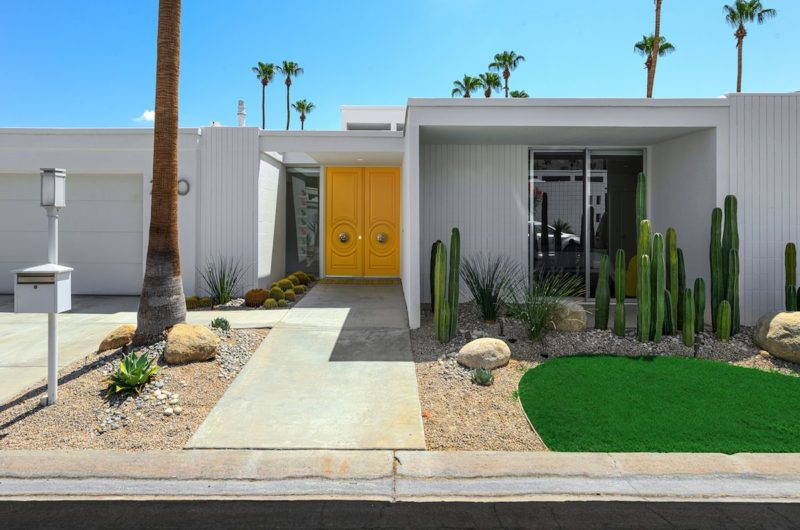 This contemporary residential project was completed by H3K Design and is located in Palm Springs, California, USA. It is based on a mid-century abode that received a complete makeover in order to be up to par with modern standards of luxury and comfort. Starting off with the entryway, we observe a relatively modest facade that features crisp white walls that contrast nicely with a bright yellow door. Natural plants such as cactuses add a touch of liveliness to the front yard. At the rear of the property, there is an outdoor deck with comfortable sofas and lounging chairs that can be used for sunbathing.