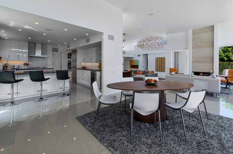 Inside, the living room flaunts a large sofa, a flat-screen TV and a striking hanging ornament placed directly above a small coffee table. Nearby, a round dining table provides seating for at least six people, while the kitchen impresses with high-end appliances. The views that can be admired from the living room are absolutely fantastic. Large windows and sliding glass doors ensure that the residents and their guests can enjoy access to the outdoors on a moment’s notice. Indoor fireplaces and outdoor fire pits add a touch of coziness and contribute to a welcoming and warm ambiance.