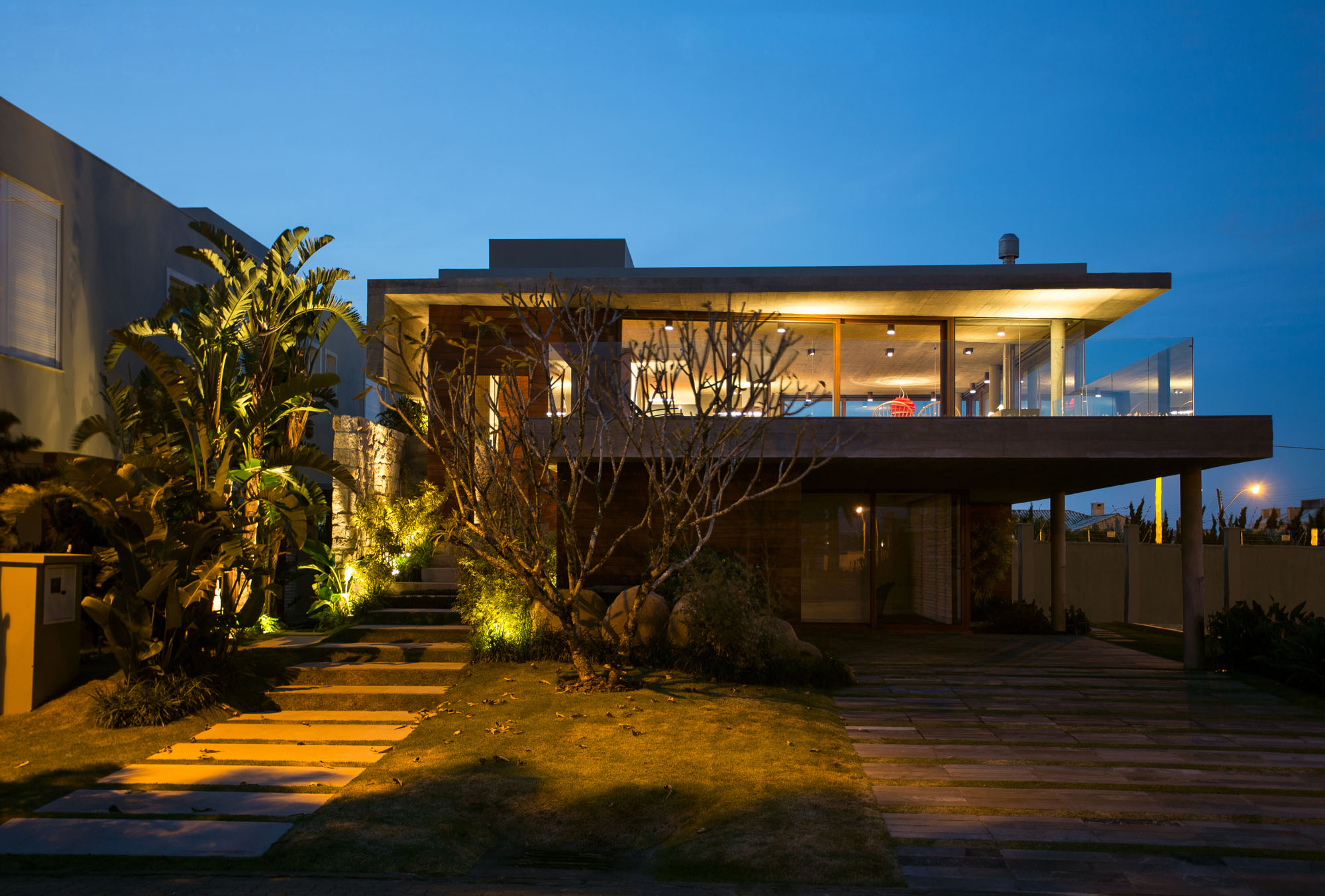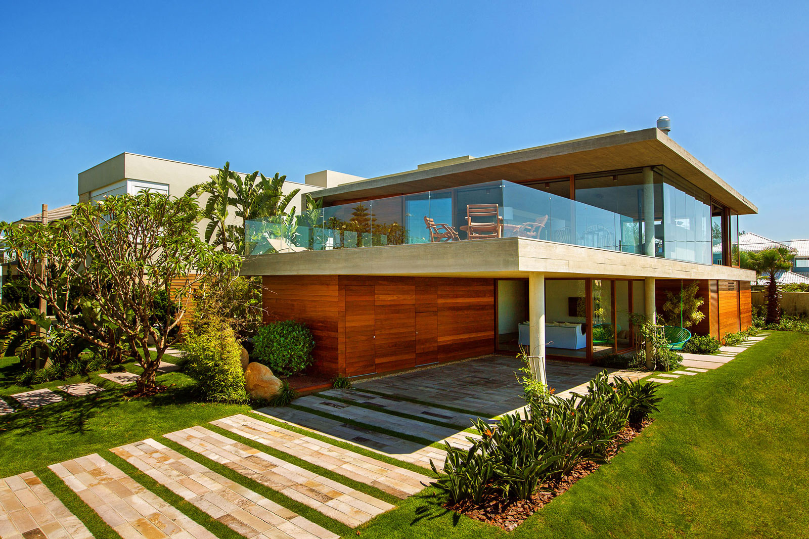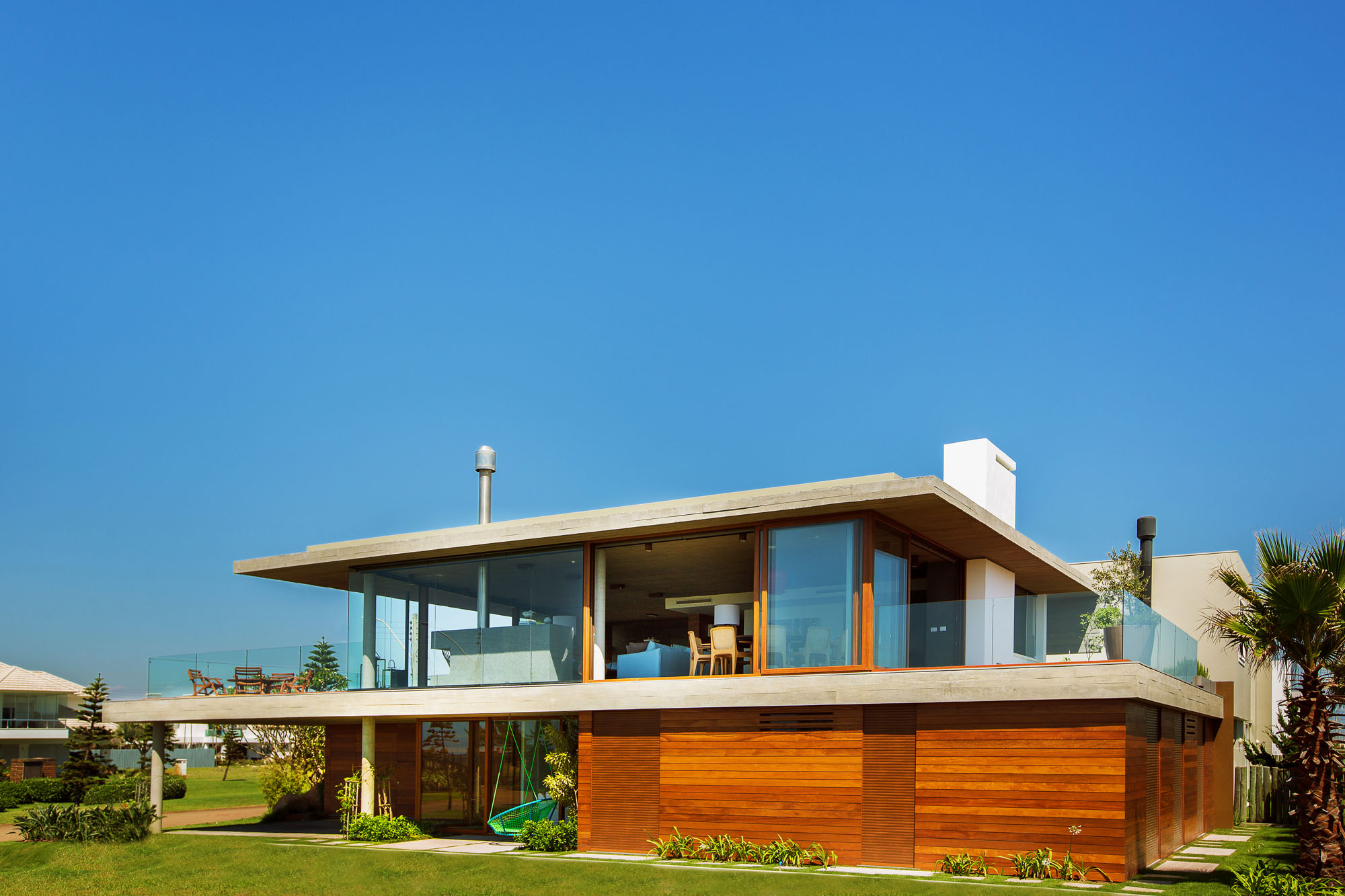 The lining of the living is the very slab of the house, exquisitely performed, revealing structural characteristics and maintaining the external architectural language.