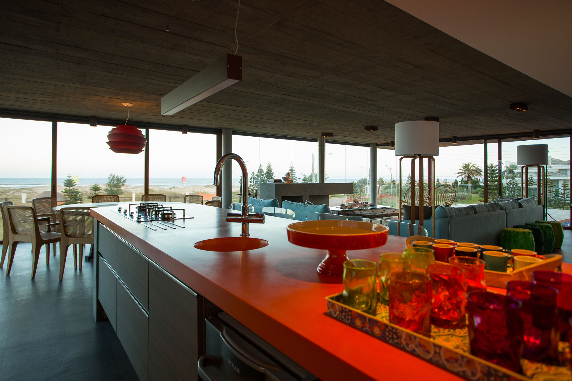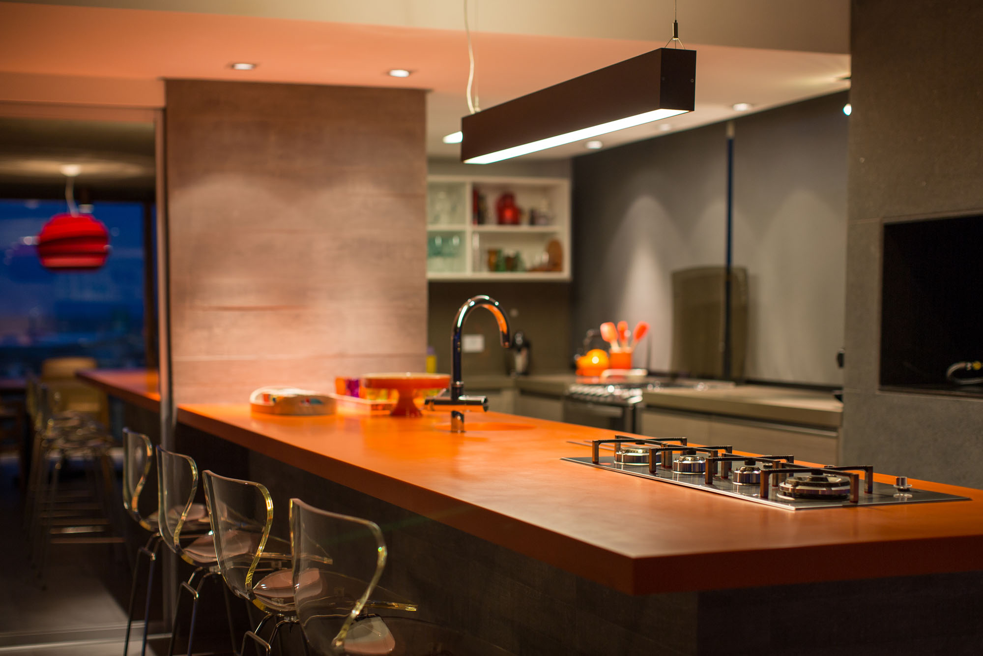 A large orange countertop, gourmet area, imposes its presence of vibrant color in space. The ground brings together the four suites that guarantee the privacy and comfort of the couple, their two daughters and guests.