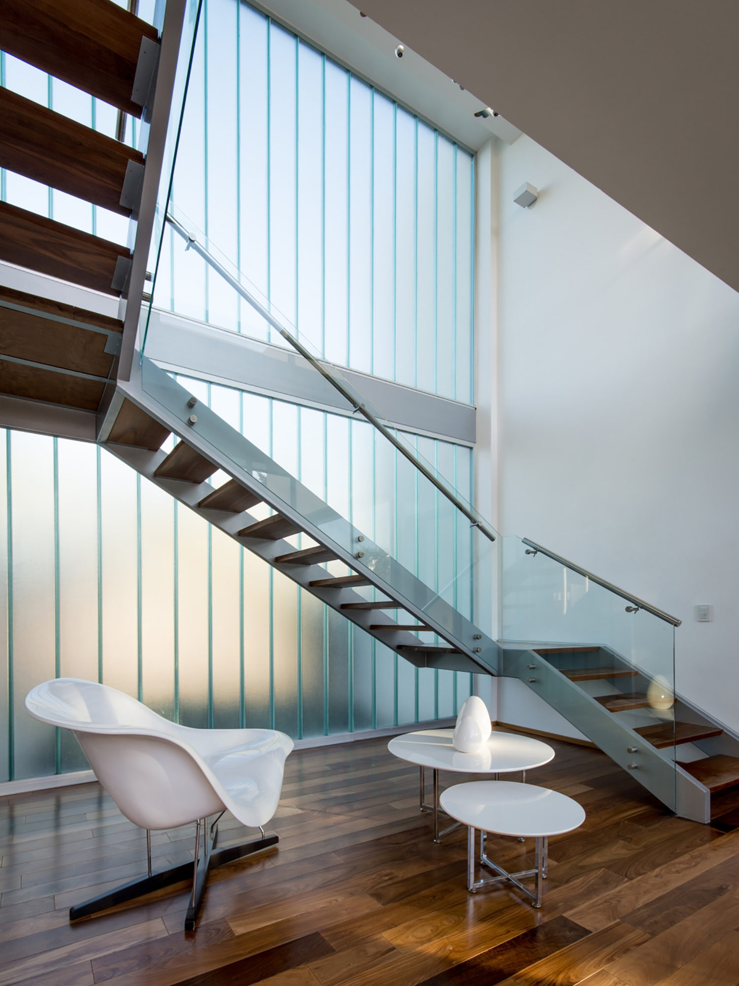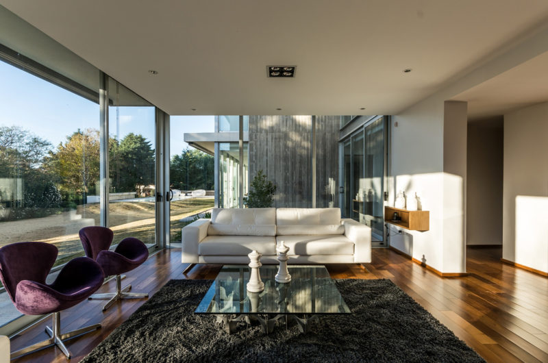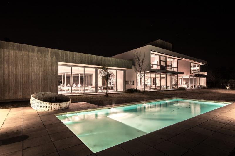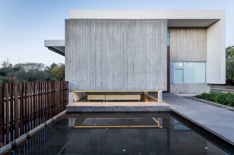 The façade was put together using durable materials such as glass, concrete and metal, but wooden elements were also implemented for a touch of naturalness and elegance. Inside, the abode includes 2 levels that are linked by a glass prism. The upper level houses the private areas such as the bedrooms, while the ground level incorporates the social areas such as the living room and kitchen. The second floor is reachable via a staircase that boasts wooden steps and glass railings. Outside, a terrace and a decent-sized swimming pool stand ready to offer great relaxation and socialization opportunities for the residents and their guests.