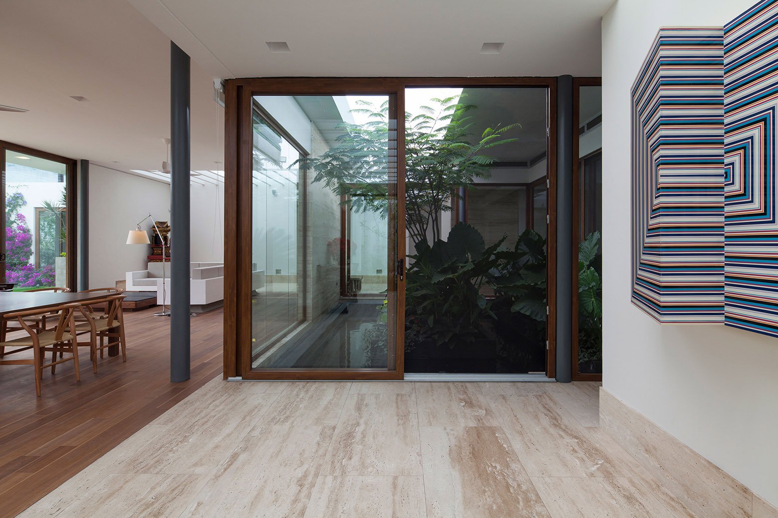 We inject natural lighting through different systems: overhead lighting in domes and courtyards, through windows and finally indirect natural light offsetting slabs at different heights. Materials such as travertine marble for floors and main walls, walnut for the living room and woodwork, tiles and white walls, and transparent floor to ceiling glass resulted in the feeling of a fresh, open, warm and much larger space.