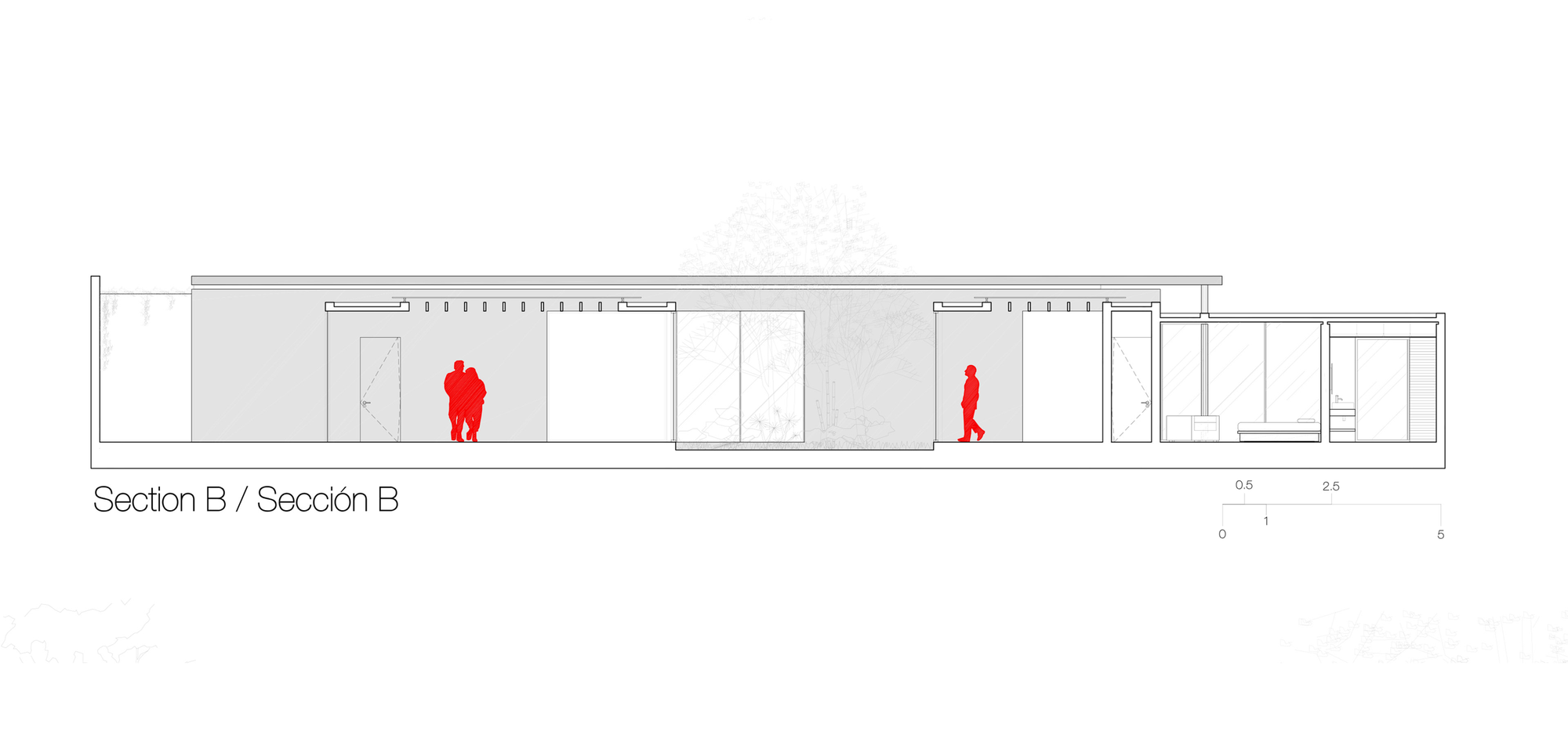 We take avantage of the main tree on the property and turn the project around it. On a single level we insert eight indoor gardens for each space, giving each one a different contact with nature. Inside we start our design from the central garden: A “tabachín” that floats on a reflecting pool and serves as the heart of the house, a connection between all spaces. The guest rooms open onto the interior gardens respectively, the garden of ferns and Macuilli garden. The master bedroom in the most private area opens onto the bougainvillea garden and the main garden, which is also connected to the living room, terrace, pool and dining room.