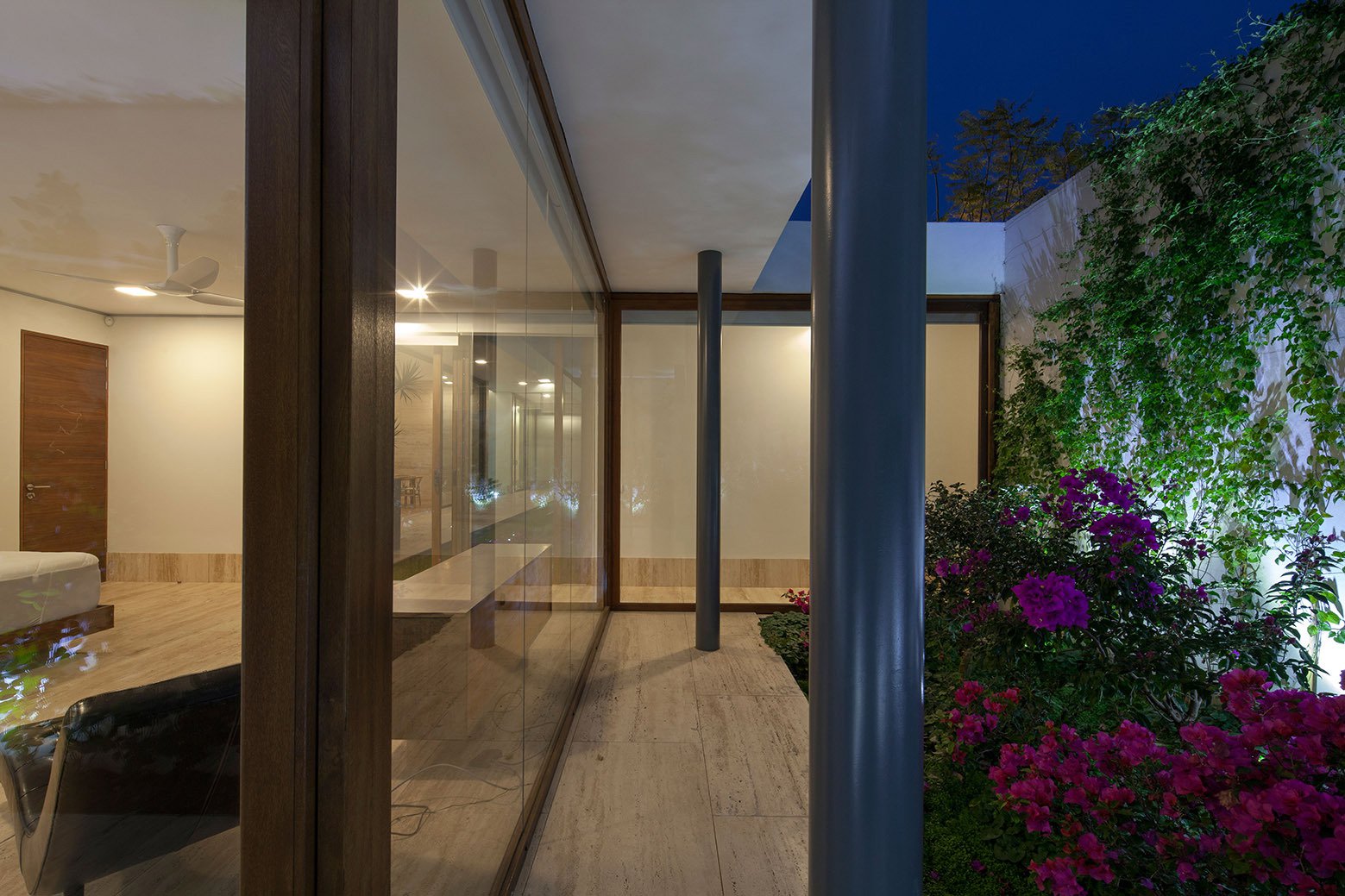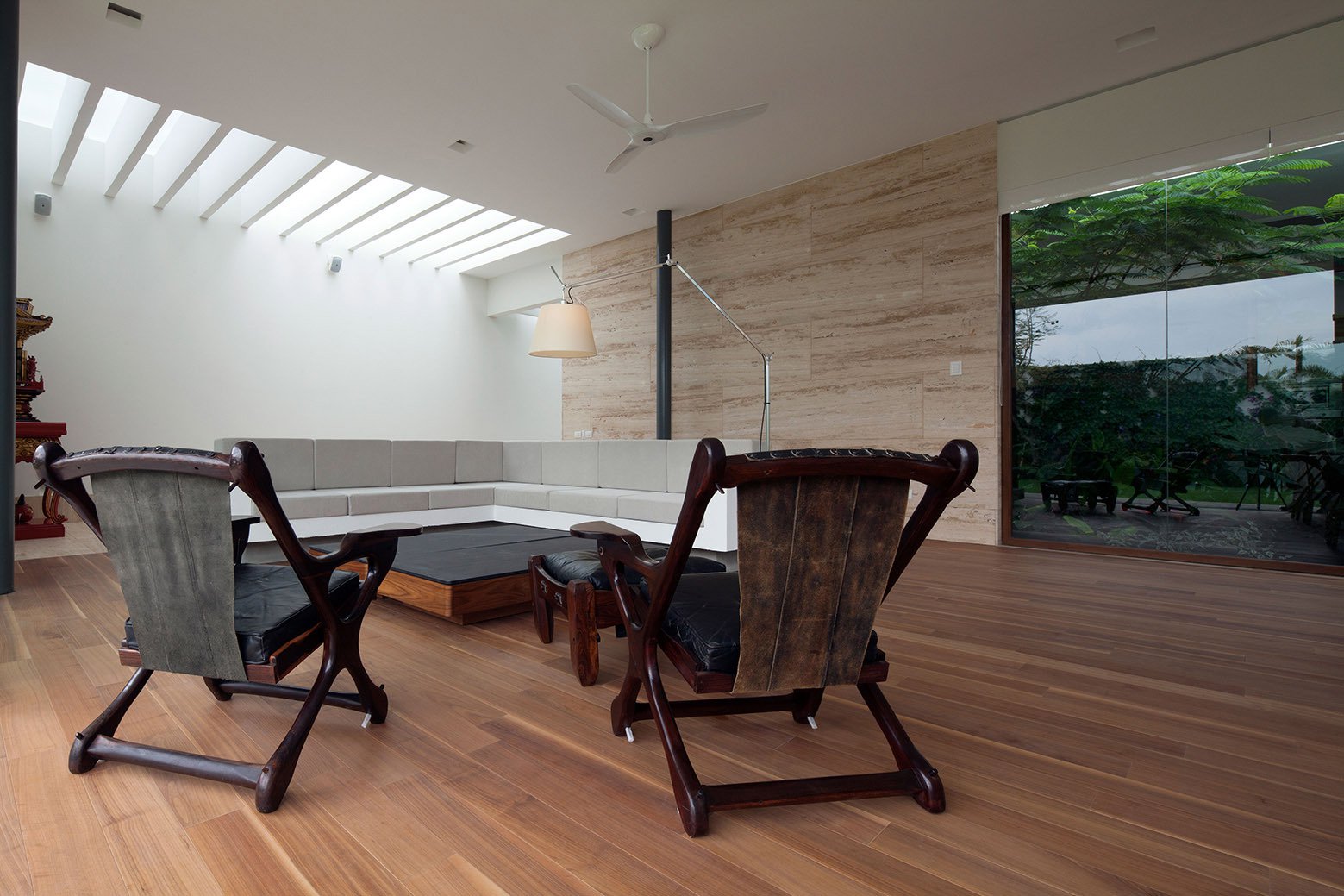 A certain degree of sustainability was achieved by installing solar hot water heaters, photocells for electricity as well as LED lighting and water catchment and treatment systems. Each and every livable space benefits from its own indoor garden, and all living areas are linked to a central “tabachín” that floats in a pond. The master bedroom flaunts views of the main garden and of a bougainvillea garden, while the guest rooms open up to a Maculli garden and a fern garden. Outside, the residents enjoy access to a small lawn and a swimming pool that offers great opportunities for relaxation.