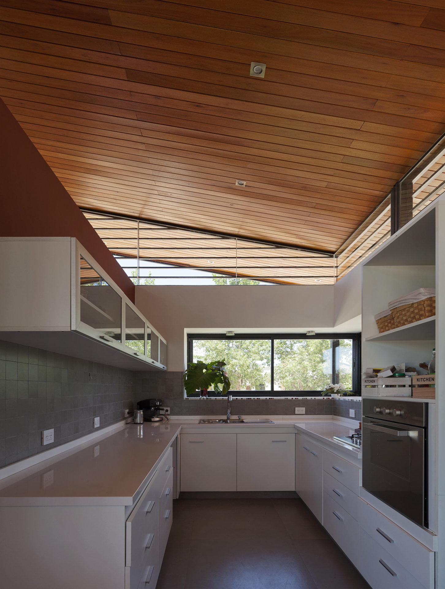 The social areas of the residence include a kitchen, a living/dining area as well as a multipurpose barbecue space. The barbecue area boasts perfect views of a nearby park and of the swimming pool. In order to fade the limits between the indoors and outdoors, the architects implemented sliding glass doors and other transparent features.