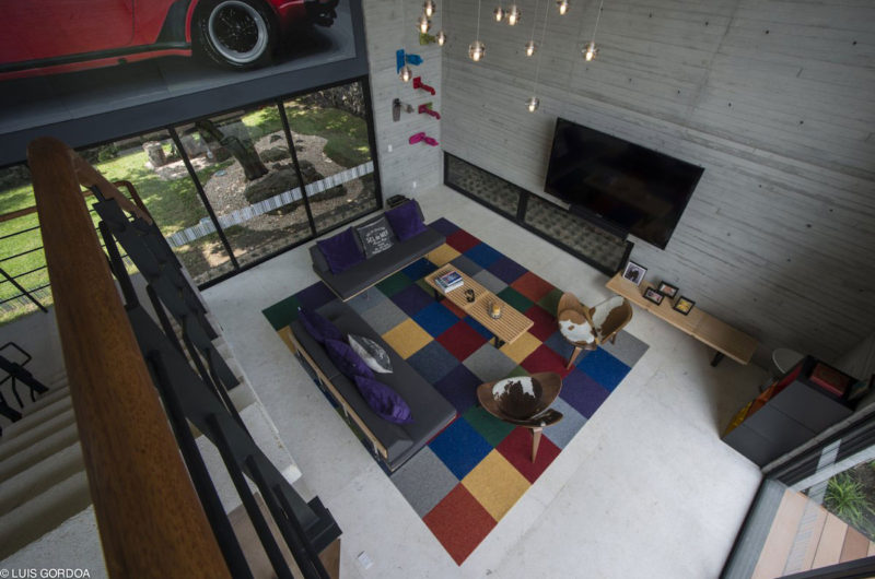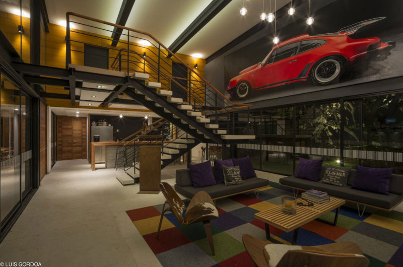 For this project, we decided to integrate art into architecture so that the selected works became a part of the design instead of functioning as mere decorative items. With this principle in mind, we commissioned a hyper-realistic 2 x 6 m (6.5 x 19.7 ft) painting of a Porsche 78; which was placed in a double-height space. In addition to the painting, Juan Carlos Baumgartner designed a mural that works both as the visual end of the swimming pool and as the vestibule of the house entrance.