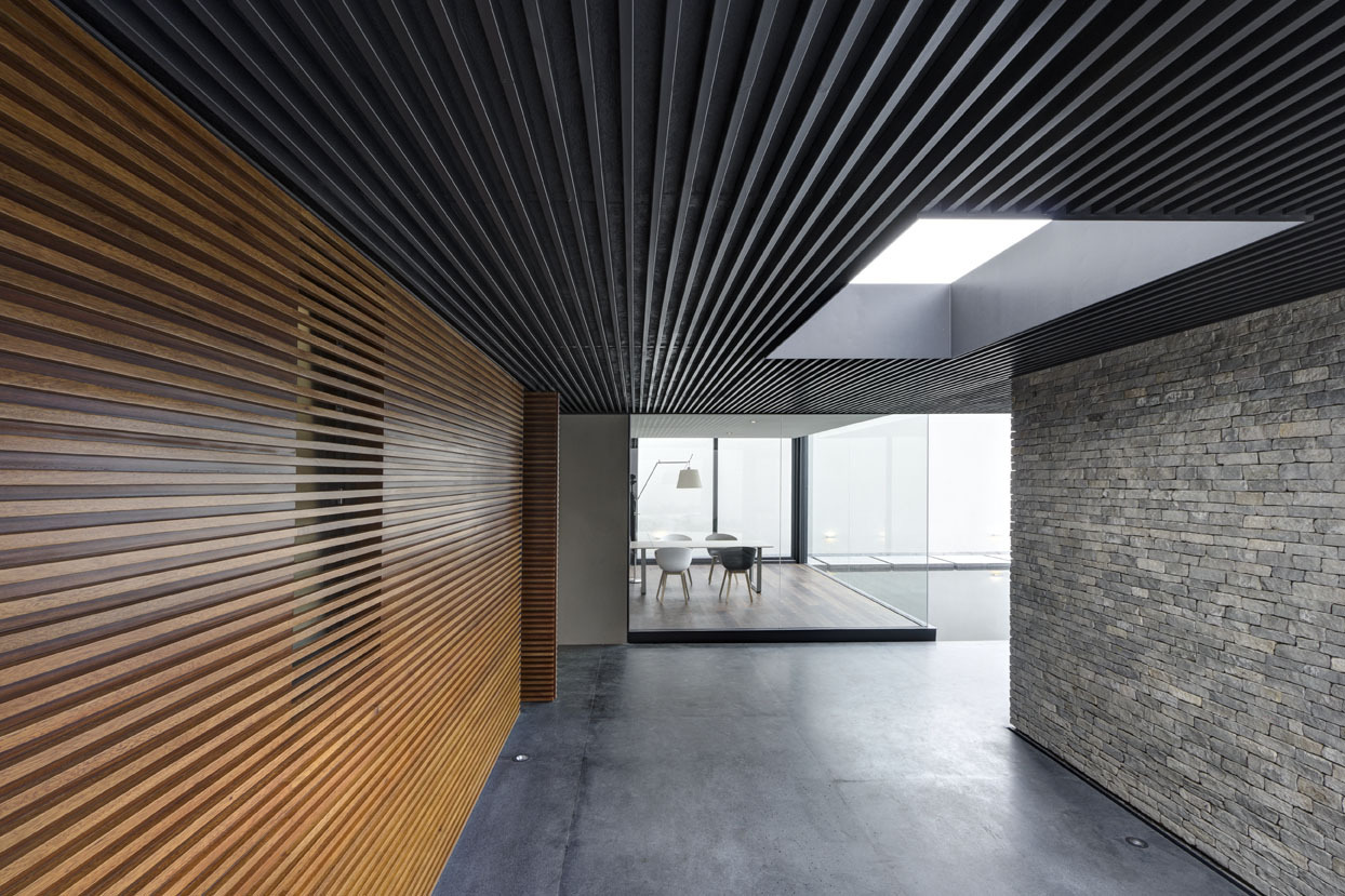 The main entry into the complex proceeds to an open passageway that runs along a rough-hewn stone wall and postpones the access into the house an additional number of meters. A glazed box containing a studio protrudes from the building. It hovers above a large pond that can be crossed via a series of stone pavers that rise above the water and lead directly into the public areas of the house. The garage, concealed on the other side of the stone wall, compels cars to park sideways so as to render them invisible from any space in the house.