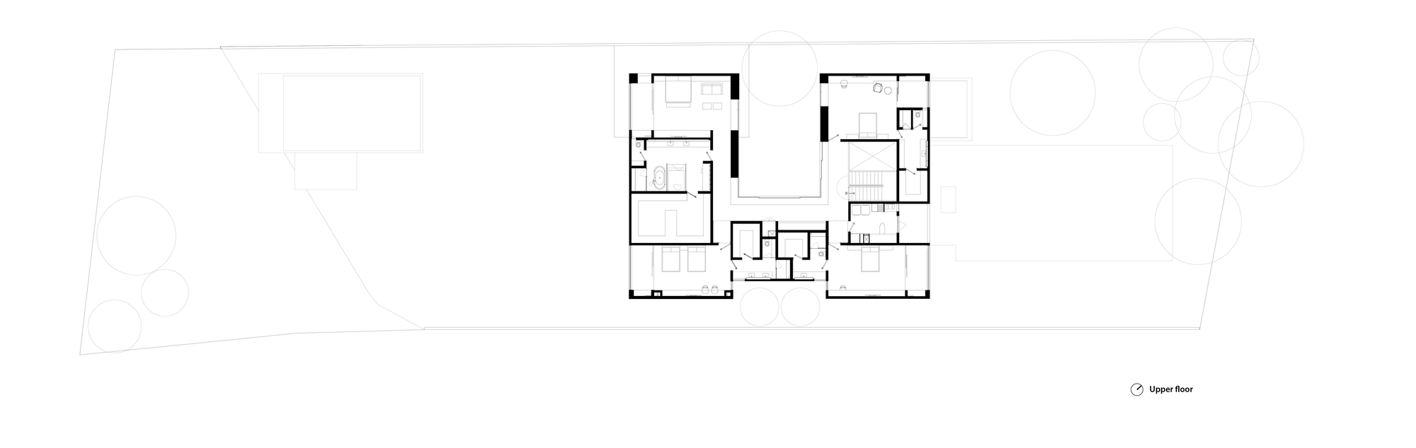 Expanding on the theme of permeability that dominates the ground floor, similar solutions were implemented throughout the living quarters on the second level, to allow for the private, open spaces. Such is the case with the small, glazed atrium that ventilates the master bathroom and the deeply recessed balconies that yield generous exterior areas to all bedrooms.