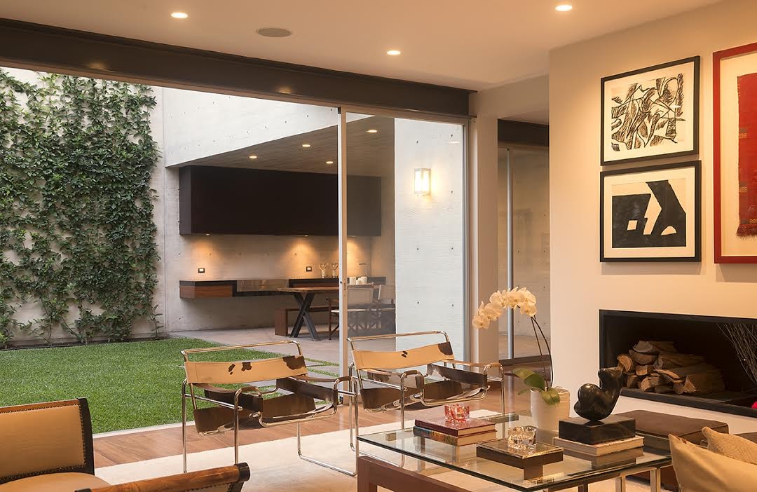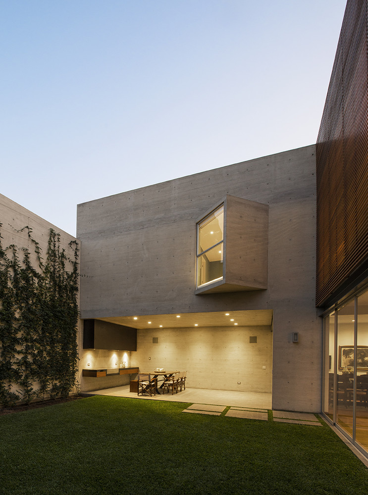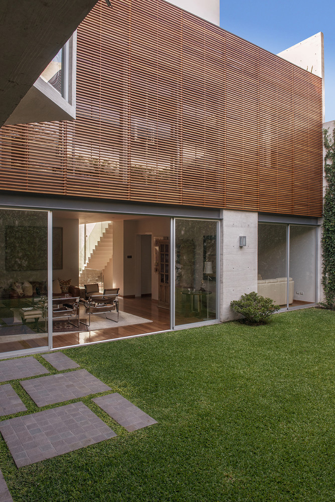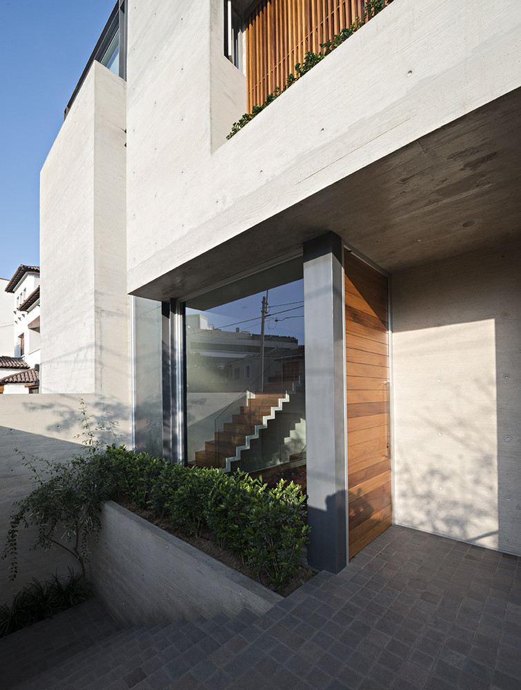 House V is a contemporary project completed in 2014 by Jaime Ortiz de Zevallos. It is located in Lima, Peru and was built using concrete and steel. It offers 3,552 square feet of living space and rests on a small plot between two existing houses within a quiet neighborhood. It was raised above street level, which is why it features an underground storage space, a gymnasium, a terrace and a garage. This underground space is linked to the rest of the house via a pair of stairwells.
