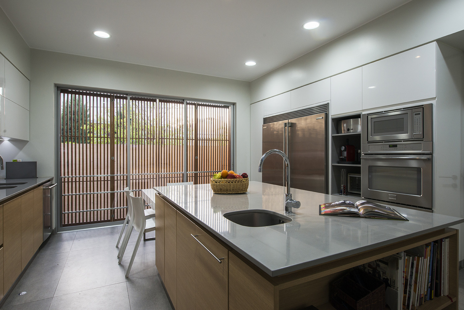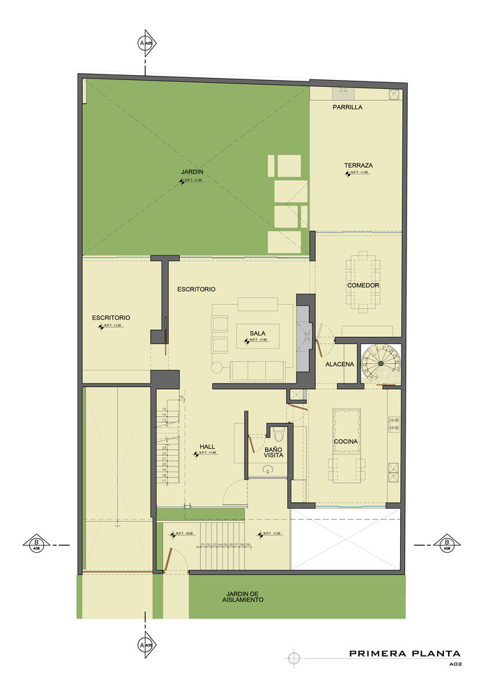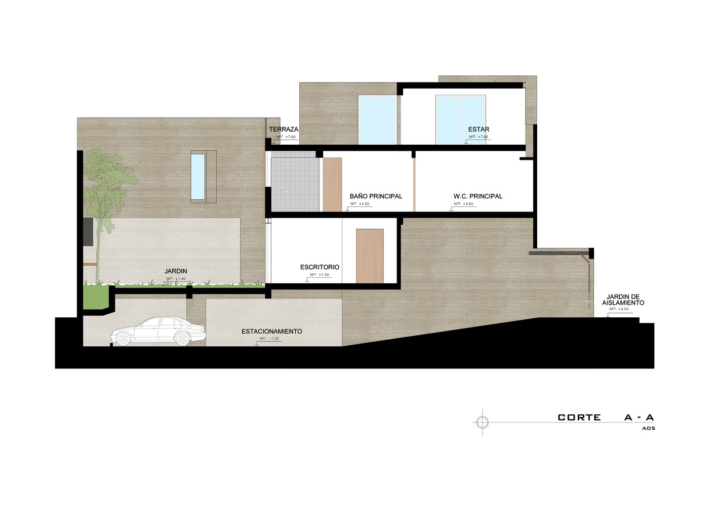 In order to gain more garden space privacy and a controlled view to the outside, the house was raised above street level generating a large underground garage, storage, and gym with a terrace connected to the house through two stairwells.